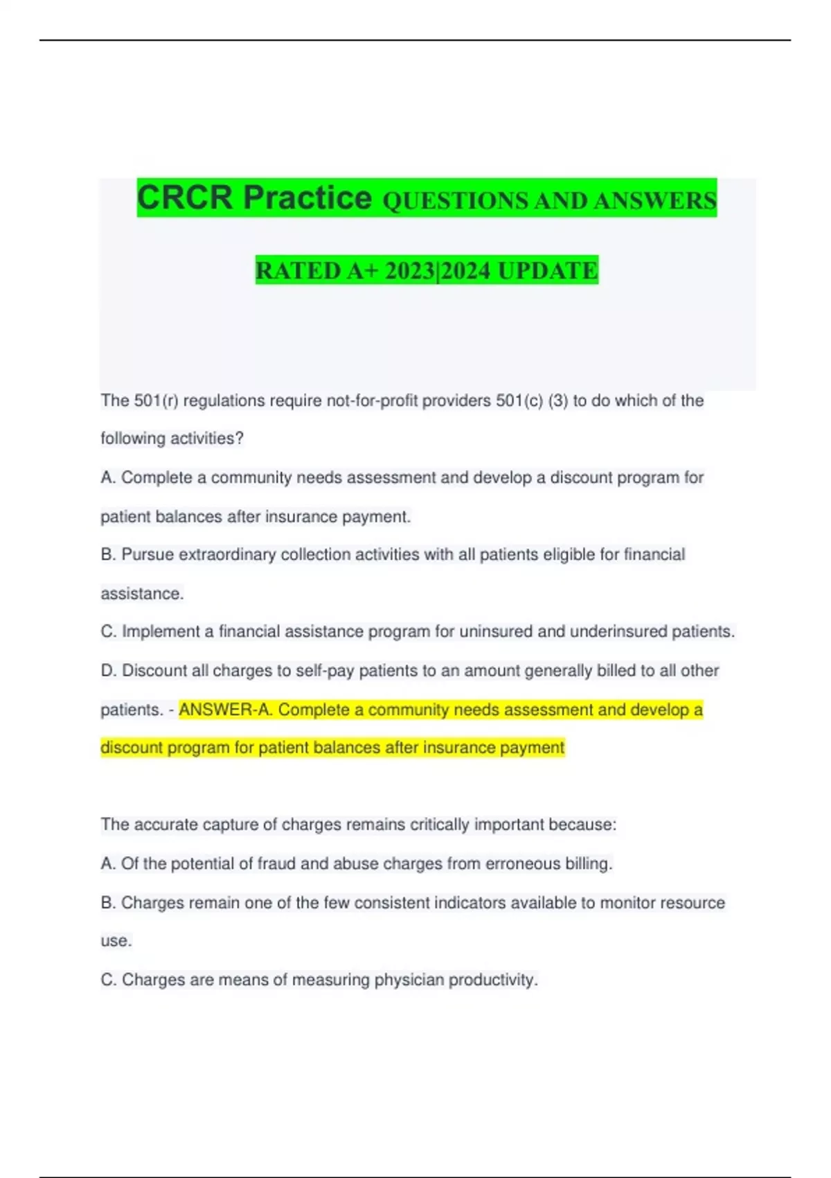 CRCR Practice QUESTIONS AND ANSWERS RATED A+ 2023|2024 UPDATE The 501(r) regulations require not-for-profit providers 501(c) (3) to do which of the following activities? A. Complete a community needs assessment and develop a discount program for patient balances after insurance payment. B. Pursue extraordinary collection activities with all patients eligible for financial assistance. C. Implement a financial assistance program for uninsured and underinsured patients. D. Discount all charges to self-pay patients to an amount generally billed to all other patients. - ANSWER-A. Complete a community needs assessment and develop a discount program for patient balances after insurance payment The accurate capture of charges remains critically important because: A. Of the potential of fraud and abuse charges from erroneous billing. B. Charges remain one of the few consistent indicators available to monitor resource use. C. Charges are means of measuring physician productivity. D. Charges provide the data used in activity based costing. - ANSWER-B. Charges remain one of the few consistent indicators available to monitor resource use The ACO investment model will test the use of pre-paid shared savings to: A. Invest in treatment protocols that reduce costs to Medicare B. Attract physicians to participate in the ACO payment system. C. Raise quality ratings in designated hospitals. D. Encourage new ACOs to form in rural and underserved areas. - ANSWER-D. Encourage new ACOs to form in rural and underserved areas Across all care settings, if a patient consents to a financial discussion during a medical encounter to expedite discharge, the HFMA best practice is to: A. Have a patient financial responsibilities kit ready for the patient, containing all of the required registration forms and instructions. B. Make sure that the attending staff can answer questions and assist in obtaining required patient financial data. C. Support that choice, providing that the discussion does not interfere with patient care or disrupt patient flow. D. Decline such request as finance discussions can disrupt patient care and patient flow. - ANSWER-C. Support that choice, providing that the discussion does not interfere with patient care or disrupt patient flow