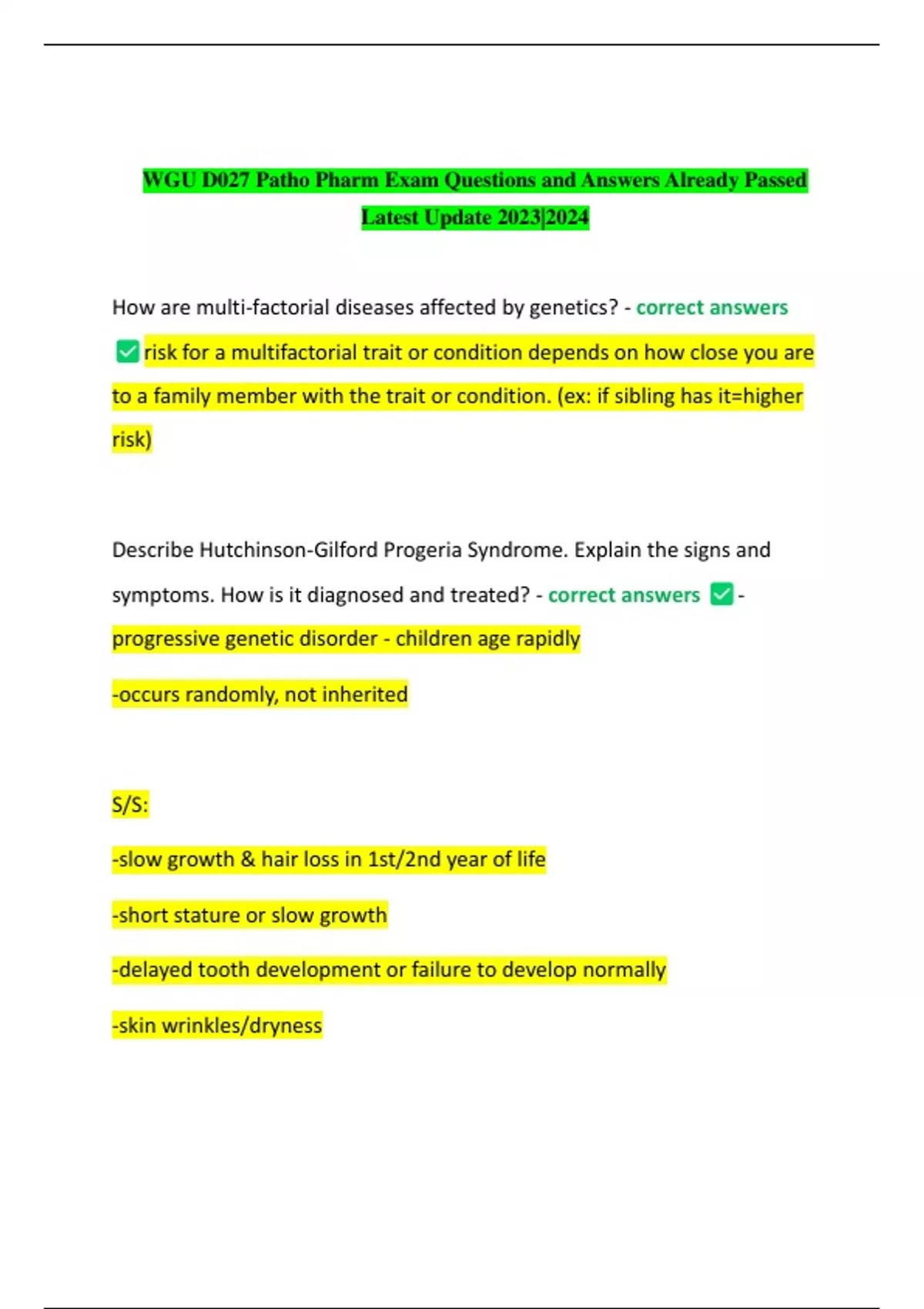 WGU D027 Patho Pharm Exam Questions and Answers Already Passed Latest Update 2023|2024 How are multi-factorial diseases affected by genetics? - correct answers risk for a multifactorial trait or condition depends on how close you are to a family member with the trait or condition. (ex: if sibling has it=higher risk) Describe Hutchinson-Gilford Progeria Syndrome. Explain the signs and symptoms. How is it diagnosed and treated? - correct answers - progressive genetic disorder - children age rapidly -occurs randomly, not inherited S/S: -slow growth & hair loss in 1st/2nd year of life -short stature or slow growth -delayed tooth development or failure to develop normally -skin wrinkles/dryness -enlarged head, hearing loss, high pitched voice, incomplete sexual maturation, joint stiffness, loss of muscle, osteoarthritis, taut skin Dx: -gentic test for LMNA -physical assessment Tx: - no cure -PT/OT -Statins - decrease liver production of harmful cholesterol -NSAIDS - relieve pain and decrease inflammation -meds to strengthen/build bones PRNs for anxiety - correct answers f*cking benzos baby - alprazolam, chlordiazepoxide, clonazepam, diazepam, lorazepam What are the body's compensatory mechanisms? - correct answers - Autonomic nervous system - Cardiac rate/contracti
