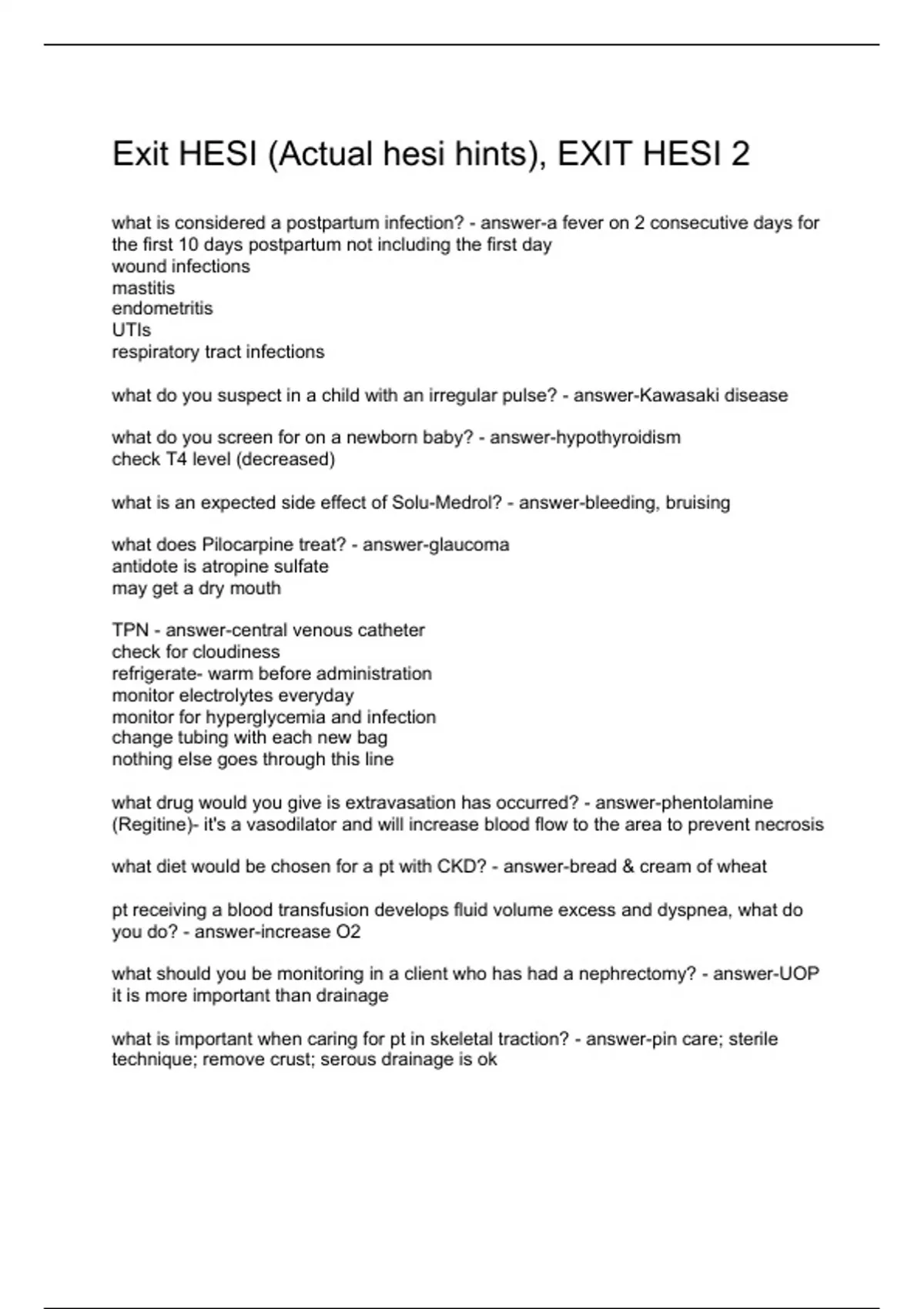 what is considered a postpartum infection? - answer-a fever on 2 consecutive days for the first 10 days postpartum not including the first day wound infections mastitis endometritis UTIs respiratory tract infections what do you suspect in a child with an irregular pulse? - answer-Kawasaki disease what do you screen for on a newborn baby? - answer-hypothyroidism check T4 level (decreased) what is an expected side effect of Solu-Medrol? - answer-bleeding, bruising what does Pilocarpine treat? - answer-glaucoma antidote is atropine sulfate may get a dry mouth TPN - answer-central venous catheter check for cloudiness refrigerate- warm before administration monitor electrolytes everyday monitor for hyperglycemia and infection change tubing with each new bag nothing else goes through this line what drug would you give is extravasation has occurred? - answer-phentolamine (Regitine