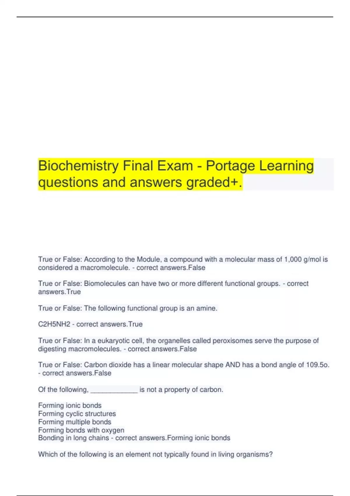 Biochemistry Final Exam - Portage Learning questions and answers graded+. True or False: According to the Module, a compound with a molecular mass of 1,000 g/mol is considered a macromolecule. - correct answers.False True or False: Biomolecules can have two or more different functional groups. - correct answers.True True or False: The following functional group is an amine. C2H5NH2 - correct answers.True True or False: In a eukaryotic cell, the organelles called peroxisomes serve the purpose of digesting macromolecules. - correct answers.False True or False: Carbon dioxide has a linear molecular shape AND has a bond angle of 109.5o. - correct answers.False Of the following, ____________ is not a property of carbon. Forming ionic bonds Forming cyclic structures Forming multiple bonds Forming bonds with oxygen Bonding in long chains - correct answers.Forming ionic bonds Which of the following is an element not typically found in living organisms? Br Ca H S Na - correct answers.Br _____________ is a functional group found in carbohydrates. - correct answers.Alcohols The following functional group is an example of _________. Ch3COCH2CH3 - correct answers.Ketone A ___________ is a chemical formula that shows how the atoms of a molecule are bonded to one another. - correct answers.Kekule' structure A collection of two or more macromolecules uniting is called a _______. - correct answers.Supramolecular Complex An organic compound with this structure, C=C, contains a ________ functional group. - correct answers.Alkene What element has been called the "super glue" of the chemical world? - correct answers.C What molecule is the most important for energy storage in cells? - correct answers.ATP What would be the approximate size of a human cell? 12 μm 1 nm 15 nm 0.2 inch 15 cm - correct answers.12 μm For pentane, there are________ carbon and ________hydrogen atoms. - correct answers.5, 12 For an organic compound, which structure is the most efficient to draw? - correct answers.Line bond When writing an organic functional group, scientists often write an "R" as part of the structure. What does the R indicate? - correct answers.Rest of the molecule According to the module, the study of carbon compounds is referred to as _____. - correct answers.Organic Chemistry The ___________ functional group was NOT discussed in this module. Alcohol Amine Aromatic Thiol All of these were discussed - correct answers.All of these were discussed Which number would be closest to the approximate number of ribosomes in an E. coli cell?