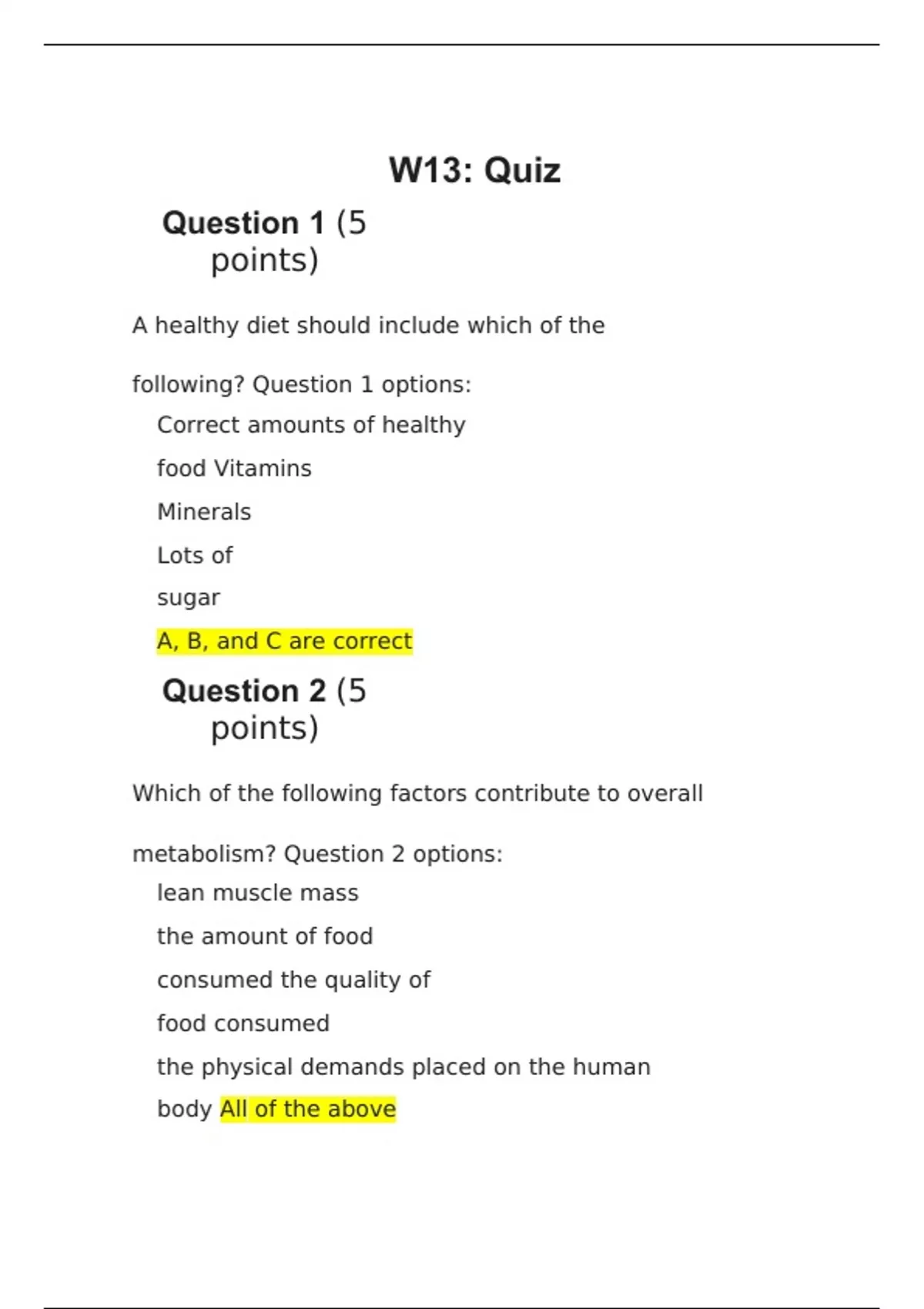 1. Question: A healthy diet should include which of the following? 2. Question: Which of the following factors contribute to overall metabolism? 3. Question: The carbohydrates, lipids, and proteins in the foods you eat are used for . 4. Question: Fever increases the body temperature and can induce chills to help cool the temperature back down. What other mechanisms are in place to regulate the body temperature? 5. Question: Starvation sets in after 3 to 4days without food. Which hormones change in response to low glucose levels? 6. Question: is the sum of all energy-requiring and energy-consuming processes of the body. 7. Question: During the absorptive state, glucose levels are and insulin levels are . 8. Question: Which of the following occur(s) very soon after a meal? 9. Question: The state, or the fasting state, occurs when the food has been digested, absorbed, and stored. 10. Question: Any excess energy we take in is stored primarily as . 11. Question: Which pathway produces the most ATP molecules? 12. Question: Which one of the following is NOT an example of an anabolic reaction? 13. Question: What process takes place in the liver and is the creating of new glucose molecules from pyruvate, lactate, glycerol, or amino acids? 14. Question: Amino acids are needed to do which one of the following? 15. Question: Lipids in the diet can be all of the following EXCEPT? 16. Question: The heat you feel on your chair when you standup was transferred from your skin via which method of heat exchange? 17. Question: The accumulation of how many calories adds one pound of weight? 18. Question: The nutritional Calorie (C) is the amount of heat it takes to raise 1000g of water by how much degree (s) Celsius? 19. Question: Which method of heat exchange is caused by the changing of the form of water from a liquid state to a gas? 20. Question: Which one of the following is considered a Trace Mineral?