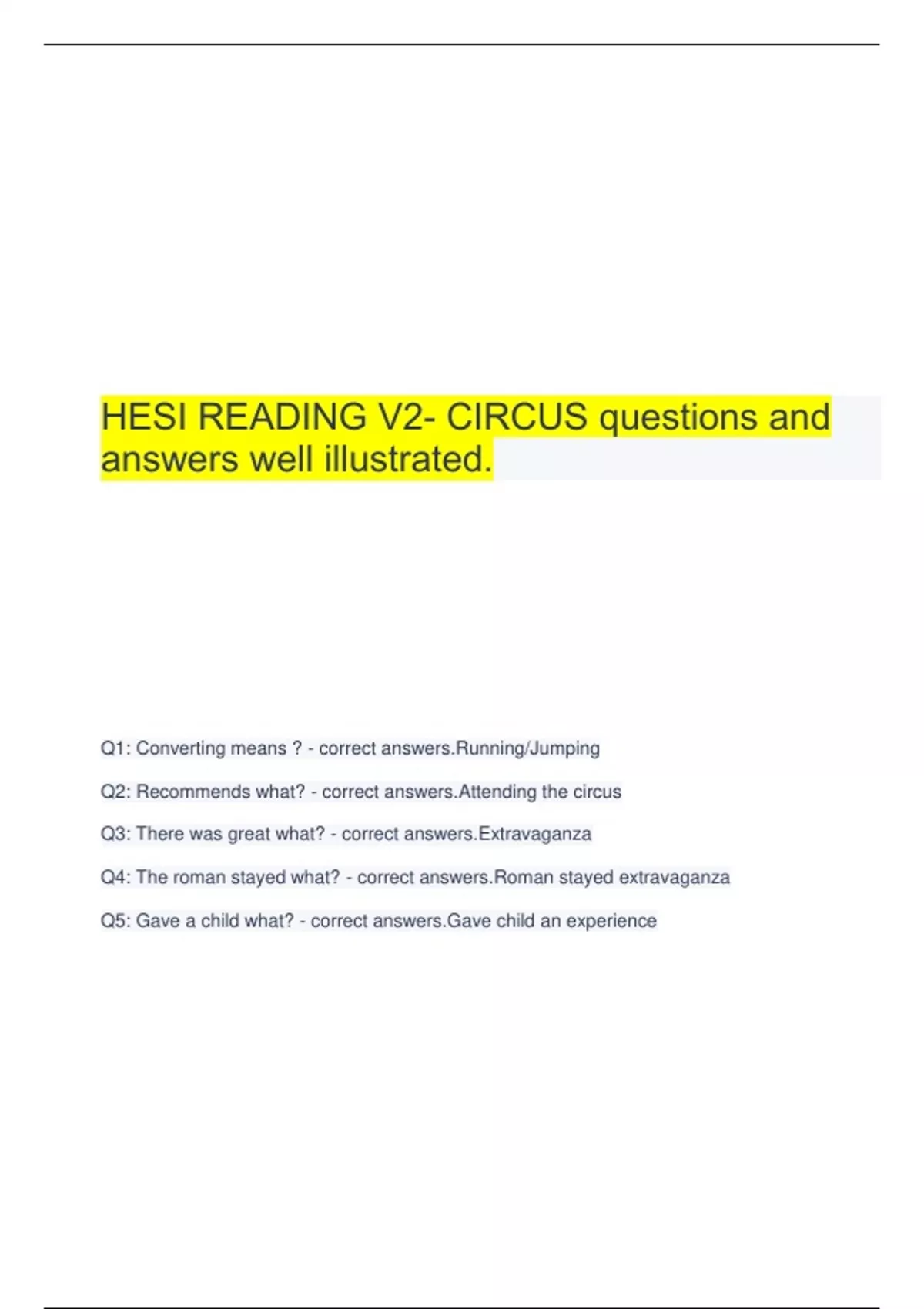 HESI READING V2- CIRCUS questions and answers well illustrated. Q1: Converting means ? - correct answers.Running/Jumping Q2: Recommends what? - correct answers.Attending the circus Q3: There was great what? - correct answers.Extravaganza Q4: The roman stayed what? - correct answers.Roman stayed extravaganza Q5: Gave a child what? - correct answers.Gave child an experience