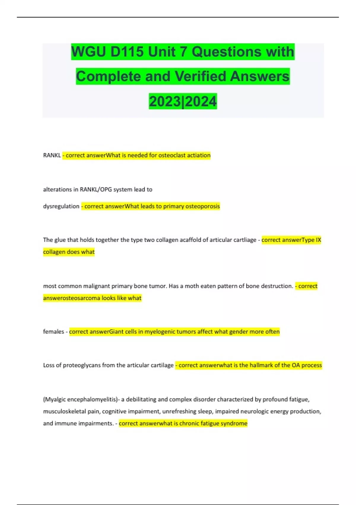 WGU D115 Unit 7 Questions with Complete and Verified Answers 2023|2024 RANKL - correct answerWhat is needed for osteoclast actiation alterations in RANKL/OPG system lead to dysregulation - correct answerWhat leads to primary osteoporosis The glue that holds together the type two collagen acaffold of articular cartliage - correct answerType IX collagen does what most common malignant primary bone tumor. Has a moth eaten pattern of bone destruction. - correct answerosteosarcoma looks like what females - correct answerGiant cells in myelogenic tumors affect what gender more often Loss of proteoglycans from the articular cartilage - correct answerwhat is the hallmark of the OA process (Myalgic encephalomyelitis)- a debilitating and complex disorder characterized by profound fatigue, musculoskeletal pain, cognitive impairment, unrefreshing sleep, impaired neurologic energy production, and immune impairments. - correct answerwhat is chronic fatigue syndrome