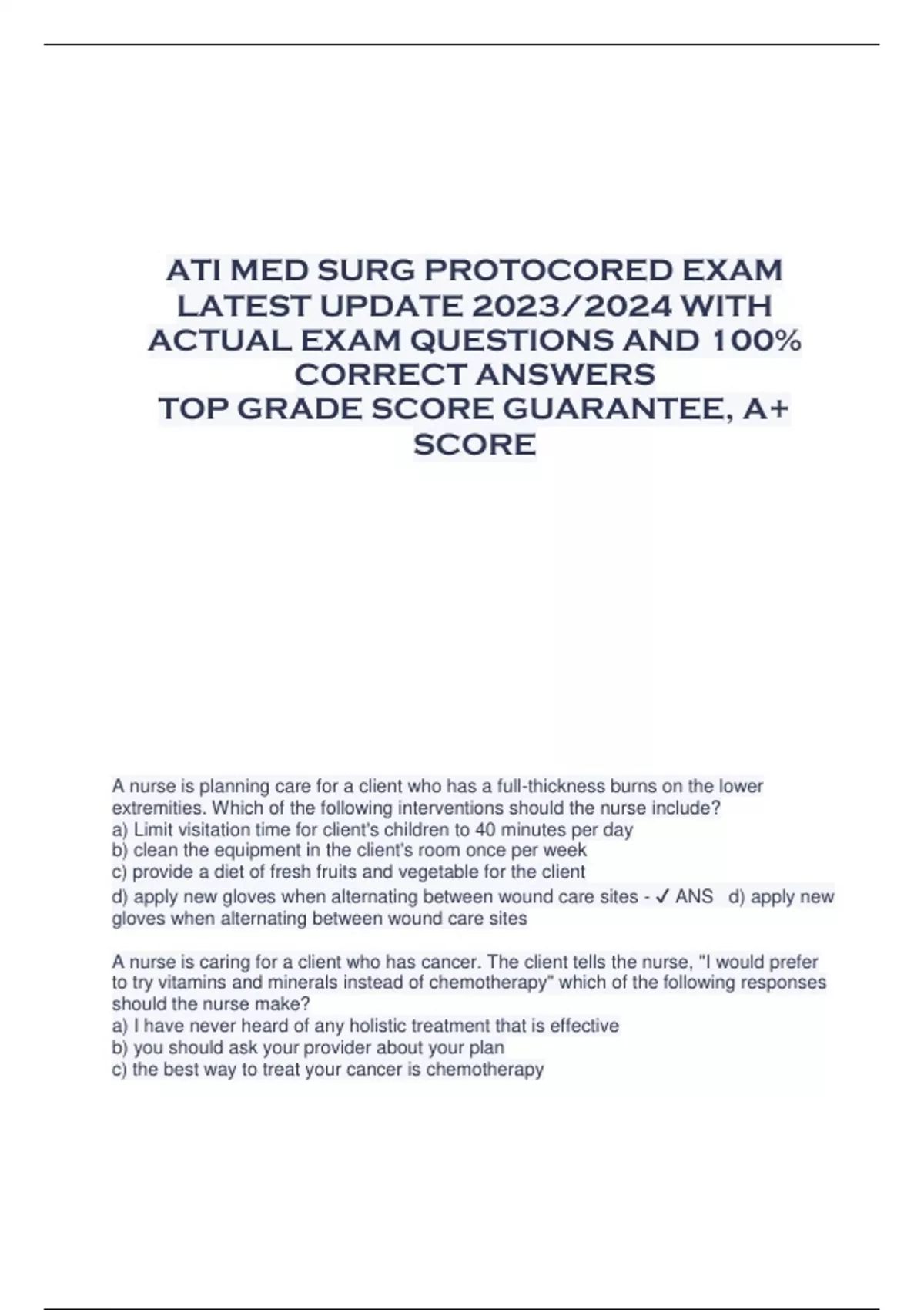 ATI MED SURG PROTOCORED EXAM LATEST UPDATE 2023/2024 WITH ACTUAL EXAM QUESTIONS AND 100% CORRECT ANSWERS TOP GRADE SCORE GUARANTEE, A+ SCORE