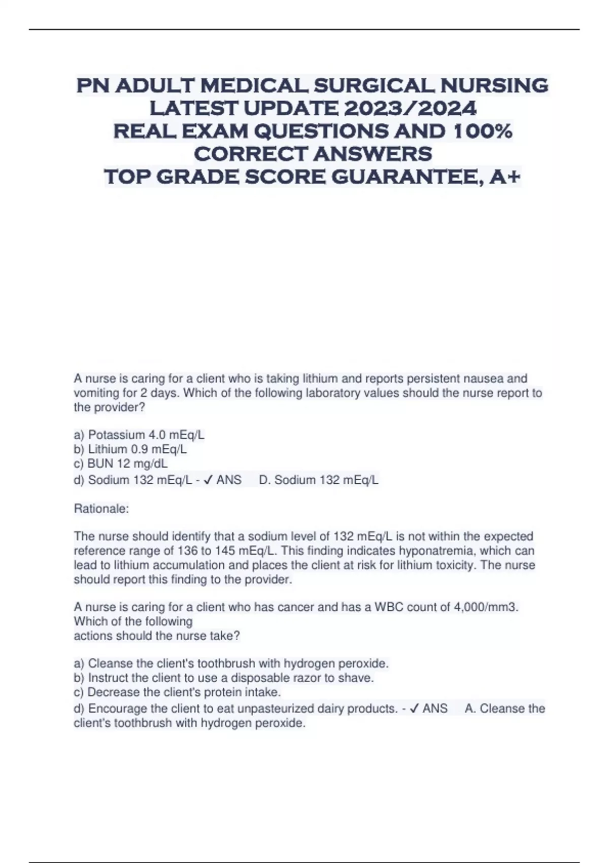 PN ADULT MEDICAL SURGICAL NURSING LATEST UPDATE 2023/2024 REAL EXAM QUESTIONS AND 100% CORRECT ANSWERS TOP GRADE SCORE GUARANTEE, A+