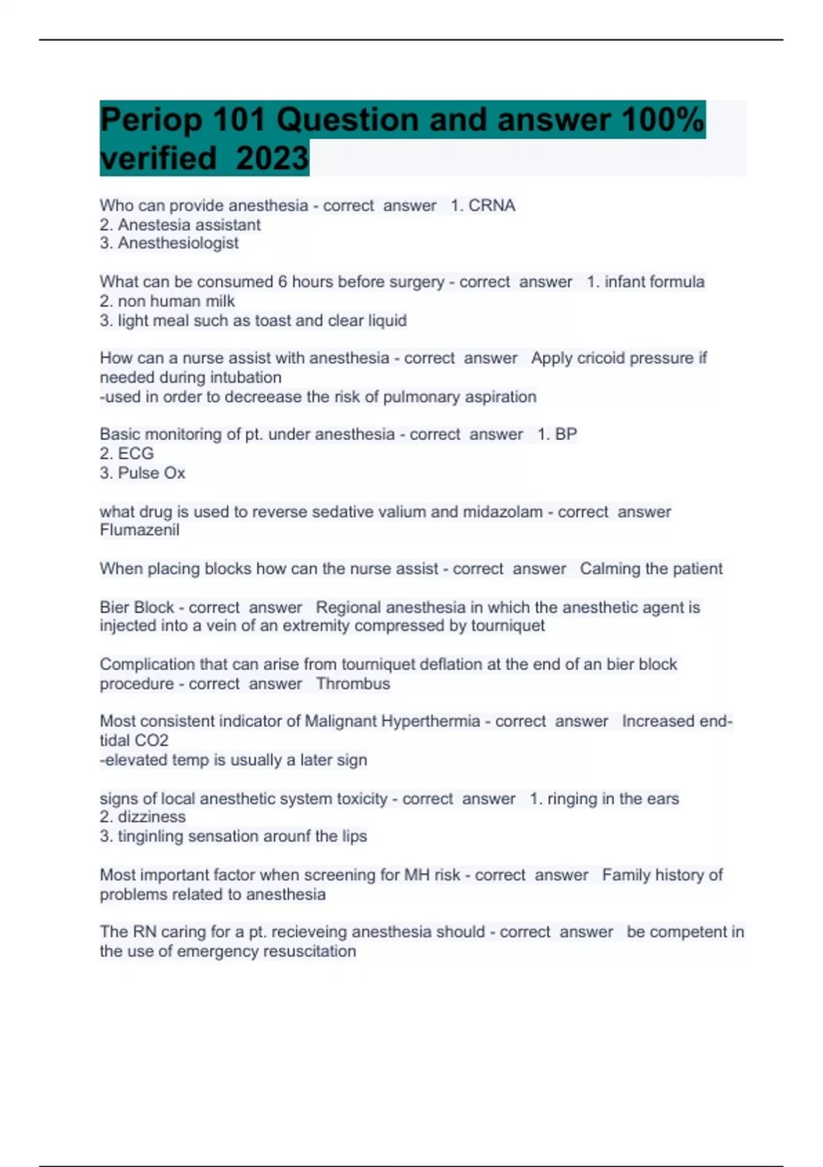 PACKAGE DEAL OF PERIOP 101 QUESTION WITH COMPLETE SOLUTION 2023