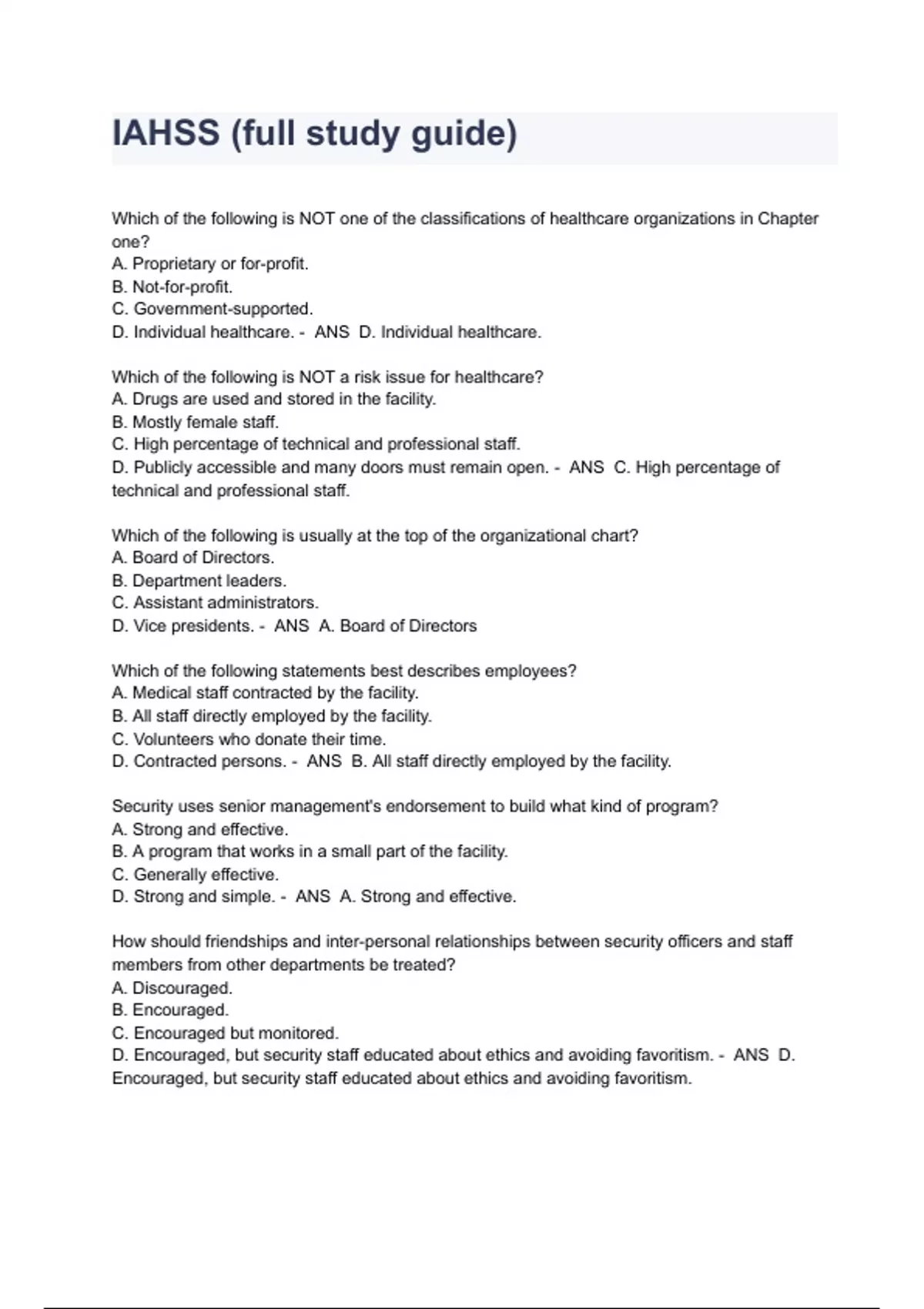 IAHSS (full study guide) Questions And Answers Which of the following is NOT one of the classifications of healthcare organizations in Chapter one? A. Proprietary or for-profit. B. Not-for-profit. C. Government-supported. D. Individual healthcare. - ANS D. Individual healthcare. Which of the following is NOT a risk issue for healthcare? A. Drugs are used and stored in the facility. B. Mostly female staff. C. High percentage of technical and professional staff. D. Publicly accessible and many doors must remain open. - ANS C. High percentage of technical and professional staff. Which of the following is usually at the top of the organizational chart? A. Board of Directors. B. Department leaders. C. Assistant administrators. D. Vice presidents. - ANS A. Board of Directors Which of the following statements best describes employees? A. Medical staff contracted by the facility. B. All staff directly employed by the facility. C. Volunteers who donate their time. D. Contracted persons. - ANS B. All staff directly employed by the facility. Security uses senior management's endorsement to build what kind of program? A. Strong and effective. B. A program that works in a small part of the facility. C. Generally effective. D. Strong and simple. - ANS A. Strong and effective. How should friendships and inter-personal relationships between security officers and staff members from other departments be treated? A. Discouraged. B. Encouraged. C. Encouraged but monitored. D. Encouraged, but security staff educated about ethics and avoiding favoritism. - ANS D. Encouraged, but security staff educated about ethics and avoiding favoritism.