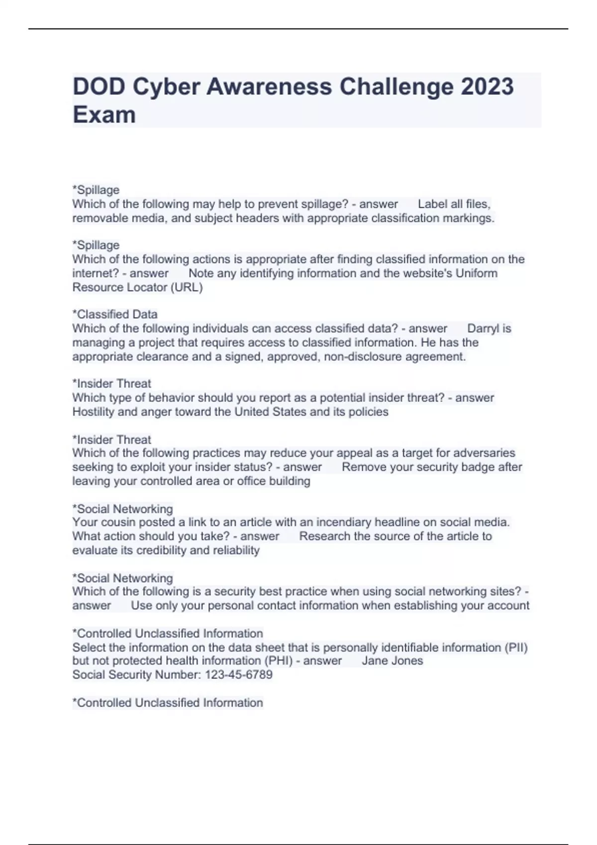 DOD Cyber Awareness Challenge 2023 Exam Questions and Answers 100% correct