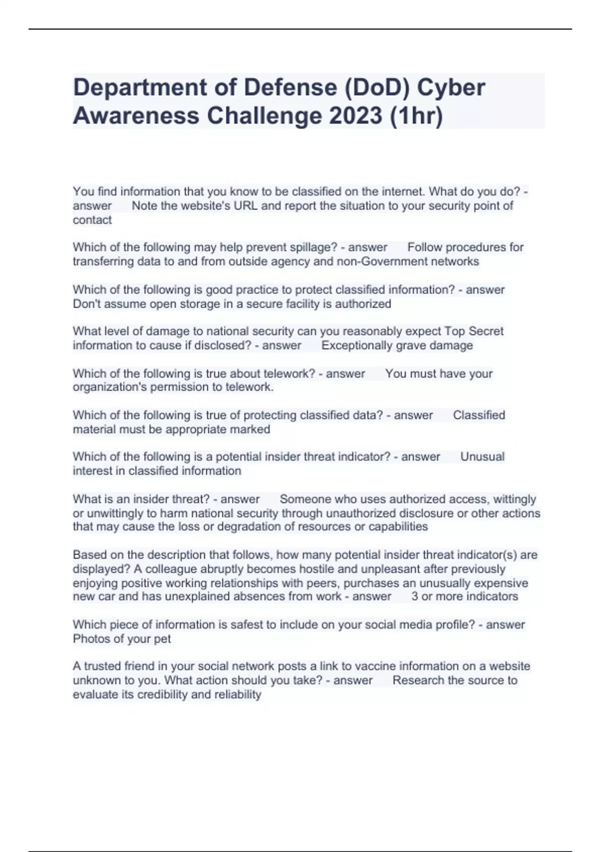 Department of Defense (DoD) Cyber Awareness Challenge 2023 (1hr) Questions and Answers 2023