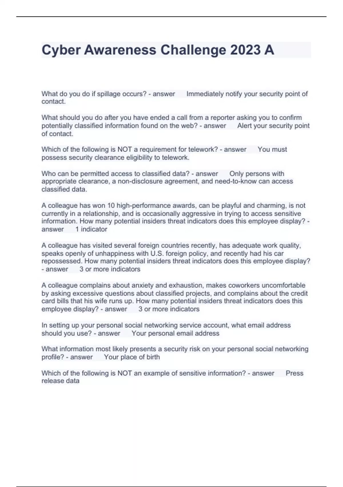 Cyber Awareness Challenge 2023 A Questions and Answers Fully solved
