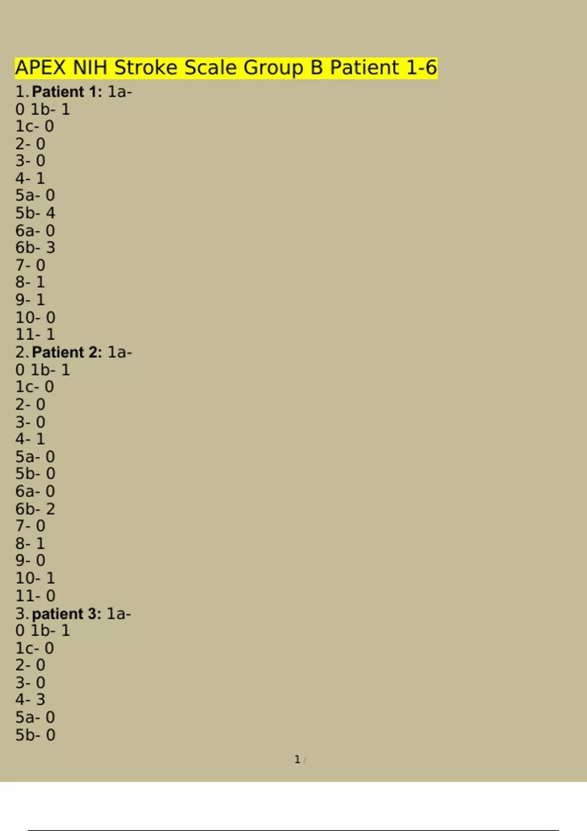APEX NIH Stroke Scale Group B Patient 1-6 Questions and Answers Latest (2023 / 2024) (Verified Answers)