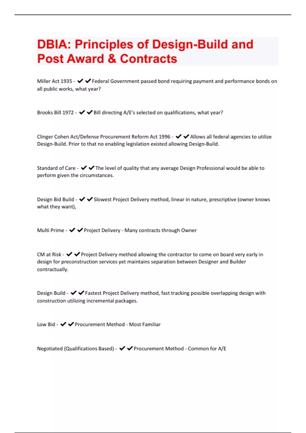 Miller Act 1935 - Federal Government passed bond requiring payment and performance bonds on all public works, what year? Brooks Bill 1972 - Bill directing A/E's selected on qualifications, what year? Clinger Cohen Act/Defense Procurement Reform Act 1996 - Allows all federal agencies to utilize Design-Build. Prior to that no enabling legislation existed allowing Design-Build. Standard of Care - The level of quality that any average Design Professional would be able to perform given the circumstances. Design Bid Build - Slowest Project Delivery method, linear in nature, prescriptive (owner knows what they want), Multi Prime - Project Delivery - Many contracts through Owner CM at Risk - Project Delivery method allowing the contractor to come on board very early in design for preconstruction services yet maintains separation between Designer and Builder contractually. Design Build - Fastest Project Delivery method, fast tracking possible overlapping design with construction utilizing incremental packages. Low Bid - Procurement Method - Most Familiar Negotiated (Qualifications Based) - Procurement Method - Common for A/EBest Value - Procurement Method - Qualifications and Price