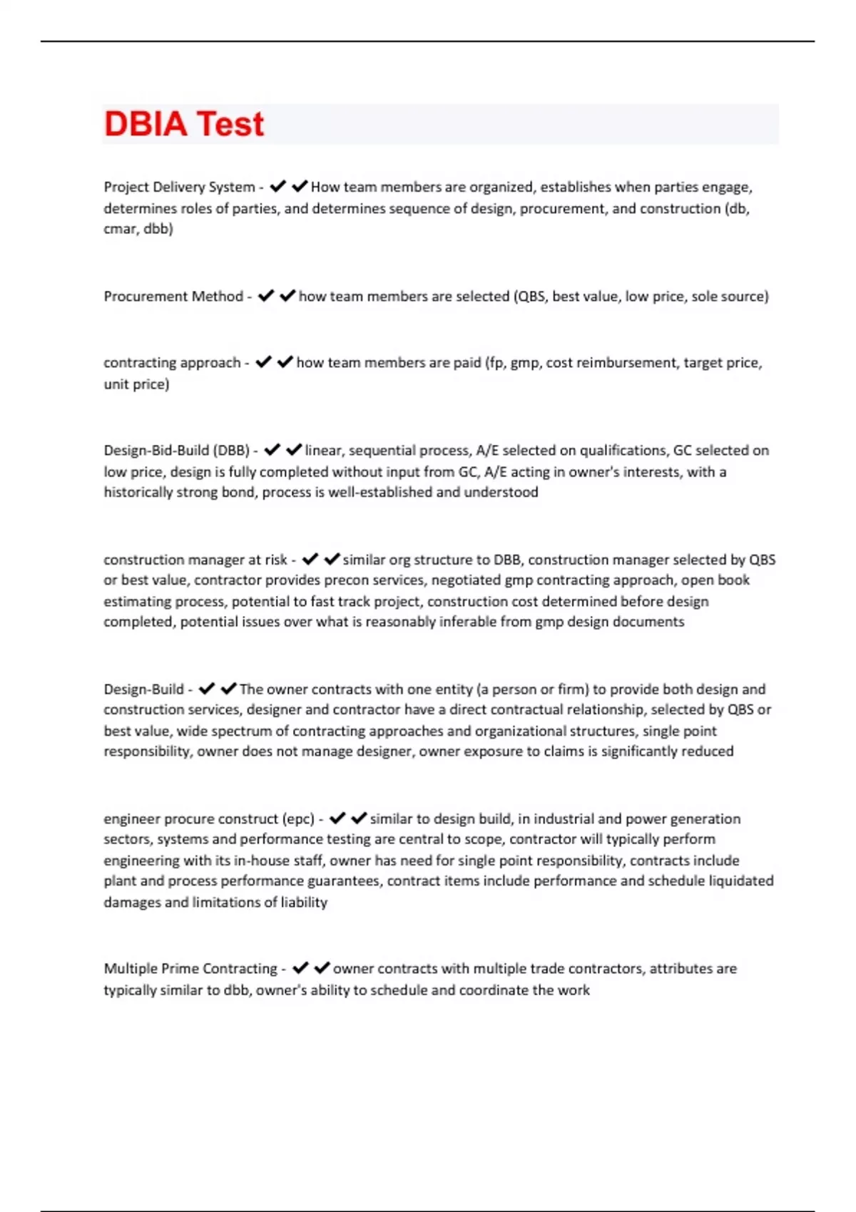 Project Delivery System - How team members are organized, establishes when parties engage, determines roles of parties, and determines sequence of design, procurement, and construction (db, cmar, dbb) Procurement Method - how team members are selected (QBS, best value, low price, sole source) contracting approach - how team members are paid (fp, gmp, cost reimbursement, target price, unit price) Design-Bid-Build (DBB) - linear, sequential process, A/E selected on qualifications, GC selected on low price, design is fully completed without input from GC, A/E acting in owner's interests, with a historically strong bond, process is well-established and understood construction manager at risk - similar org structure to DBB, construction manager selected by QBS or best value, contractor provides precon services, negotiated gmp contracting approach, open book estimating process, potential to fast track project, construction cost determined before design completed, potential issues over what is reasonably inferable from gmp design documents Design-Build - The owner contracts with one entity (a person or firm) to provide both design and construction services, designer and contractor have a direct contractual relationship, selected by QBS or best value, wide spectrum of contracting approaches and organizational structures, single point responsibility, owner does not manage designer, owner exposure to claims is significantly reduced engineer procure construct (epc) - similar to design build, in industrial and power generation sectors, systems and performance testing are central to scope, contractor will typically perform engineering with its in-house staff, owner has need for single point responsibility, contracts include plant and process performance guarantees, contract items include performance and schedule liquidated damages and limitations of liability Multiple Prime Contracting - owner contracts with multiple trade contractors, attributes are typically similar to dbb, owner's ability to schedule and coordinate the workIntegrated Project Delivery (IPD) - multi-party agreement - all parties equal, QBS procurement and target pricing contract approach, private sector use (limited at this time), key: owner's ability to accept risk