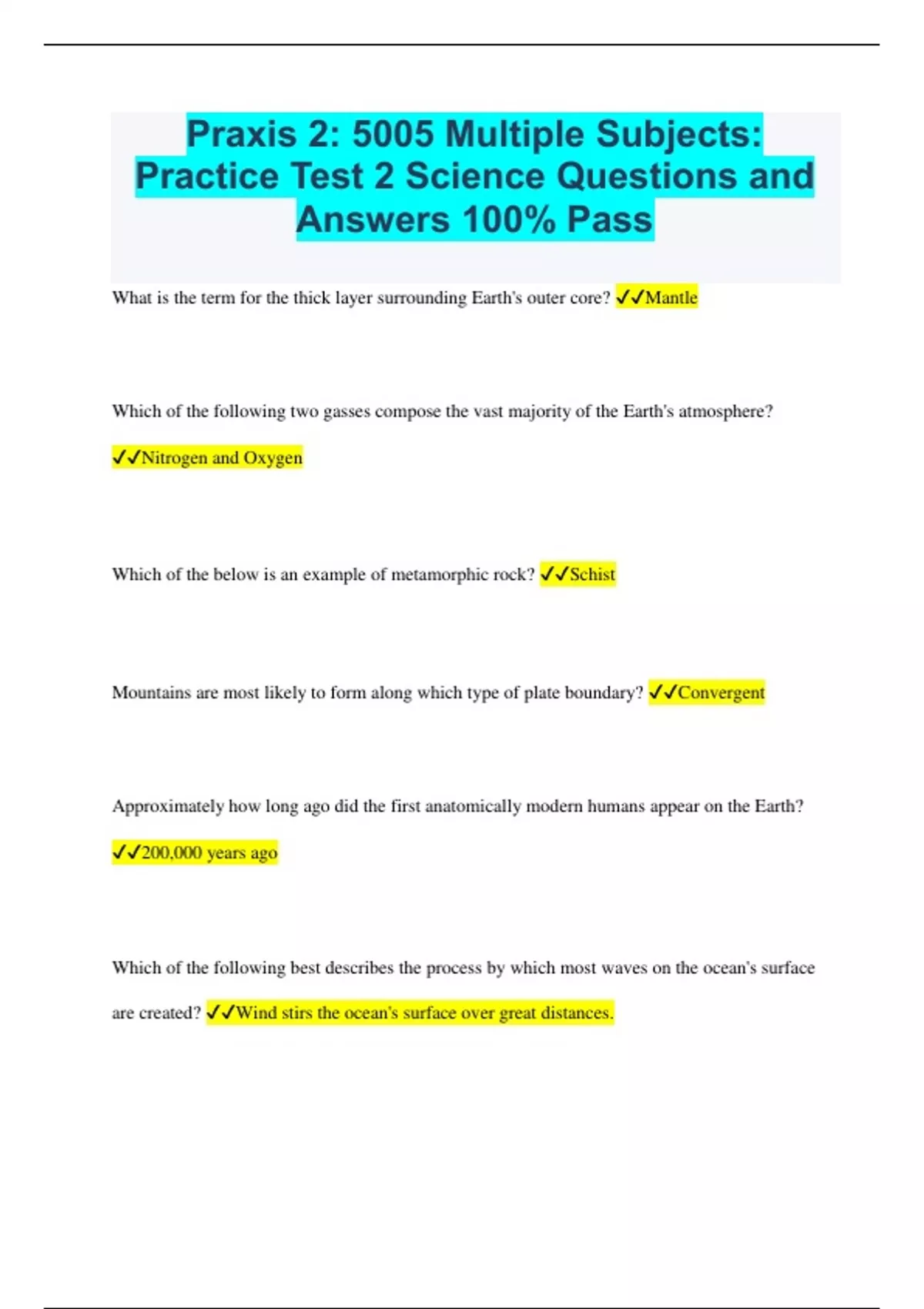 Praxis 2: 5005 Multiple Subjects: Practice Test 2 Science Questions and Answers 100% Pass What is the term for the thick layer surrounding Earth's outer core? Mantle Which of the following two gasses compose the vast majority of the Earth's atmosphere? Nitrogen and Oxygen Which of the below is an example of metamorphic rock? Schist Mountains are most likely to form along which type of plate boundary? Convergent Approximately how long ago did the first anatomically modern humans appear on the Earth? 200,000 years ago Which of the following best describes the process by which most waves on the ocean's surface are created? Wind stirs the ocean's surface over great distances. The shape of the Milky Way can best be described as ________. A spiral disk What is the moon's position relative to Earth during a lunar eclipse? The moon and sun are on opposite sides of the Earth. Months are based on which of the following? A. The Moon's revolution around the Earth. Which of the following best describes a difference in how two types of organisms maintain homeostasis? A snake depends predominantly on external factors like sunlight to regulate its body temperature, while a rabbit utilizes mainly internal processes. During which phase of mitosis do the duplicated chromosomes line up along the equatorial plate of the spindle? Metaphase Which structure is responsible for regulating basic functions such as respiration and heartbeat? Brainstem If two brown-eyed parents each carry a recessive gene for blue eyes, what is the probability of them having a blue-eyed child? 1/4 How many pairs of chromosomes are contained within a typical cell in the human body? 23 A behavioral response from an organism is determined by which of the following factors? Heredity and experience Which of the following best explains why a person cannot drink sea water? The high salinity of sea water causes tissues to become dehydrated due to the osmotic diffusion of water from within the cells. Which of these is not a division within the standard system of scientific taxonomy Rank Within a forest ecosystem, which of the following would be considered a primary consumer? Rabbit Using the periodic table, how would you find elements with chemical properties similar to Helium? Look in the column below it The time required for half the atoms of a particular substance to disintegrate is known as that substance's Half life Which of the following factors least affects a compound's tendency to change state? Mass The force of gravitational attraction between two bodies is least dependent on which of the following? Temperature of the bodies What is the term for the process of releasing atomic energy by bombarding a dense element with neutrons and splitting its nucleus? Fission As a part of a science class, a clear pot of water with heat censors
