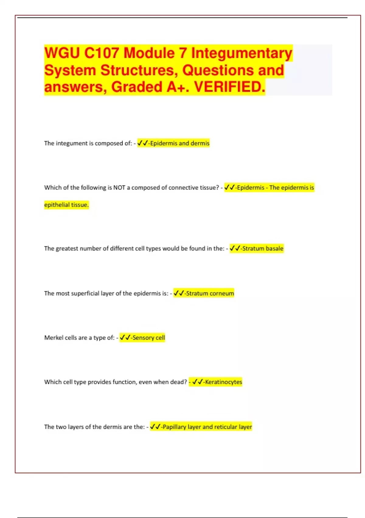 WGU C107 Module 7 Integumentary System Structures, Questions and answers, Graded A+. VERIFIED 2024