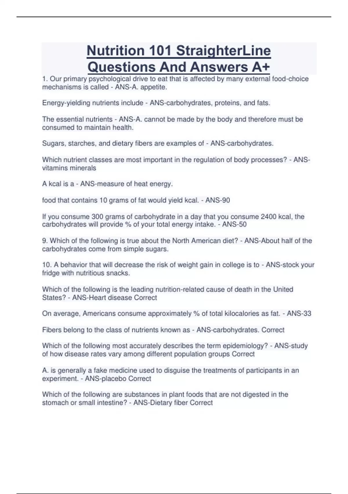 Nutrition 101 StraighterLine Questions And Answers A+ 1. Our primary psychological drive to eat that is affected by many external food-choice mechanisms is called - ANS-A. appetite. Energy-yielding nutrients include - ANS-carbohydrates, proteins, and fats. The essential nutrients - ANS-A. cannot be made by the body and therefore must be consumed to maintain health. Sugars, starches, and dietary fibers are examples of - ANS-carbohydrates. Which nutrient classes are most important in the regulation of body processes? - ANSvitamins minerals A kcal is a - ANS-measure of heat energy. food that contains 10 grams of fat would yield kcal. - ANS-90 If you consume 300 grams of carbohydrate in a day that you consume 2400 kcal, the carbohydrates will provide % of your total energy intake. - ANS-50 9. Which of the following is true about the North American diet? - ANS-About half of the carbohydrates come from simple sugars. 10. A behavior that will decrease the risk of weight gain in college is to - ANS-stock your fridge with nutritious snacks. Which of the following is the leading nutrition-related cause of death in the United States? - ANS-Heart disease Correct On average, Americans consume approximately % of total kilocalories as fat. - ANS-33 Fibers belong to the class of nutrients known as - ANS-carbohydrates. Correct Which of the following most accurately describes the term epidemiology? - ANS-study of how disease rates vary among different population groups Correct A. is generally a fake medicine used to disguise the treatments of participants in an experiment. - ANS-placebo Correct Which of the following are substances in plant foods that are not digested in the stomach or small intestine? - ANS- Continues...