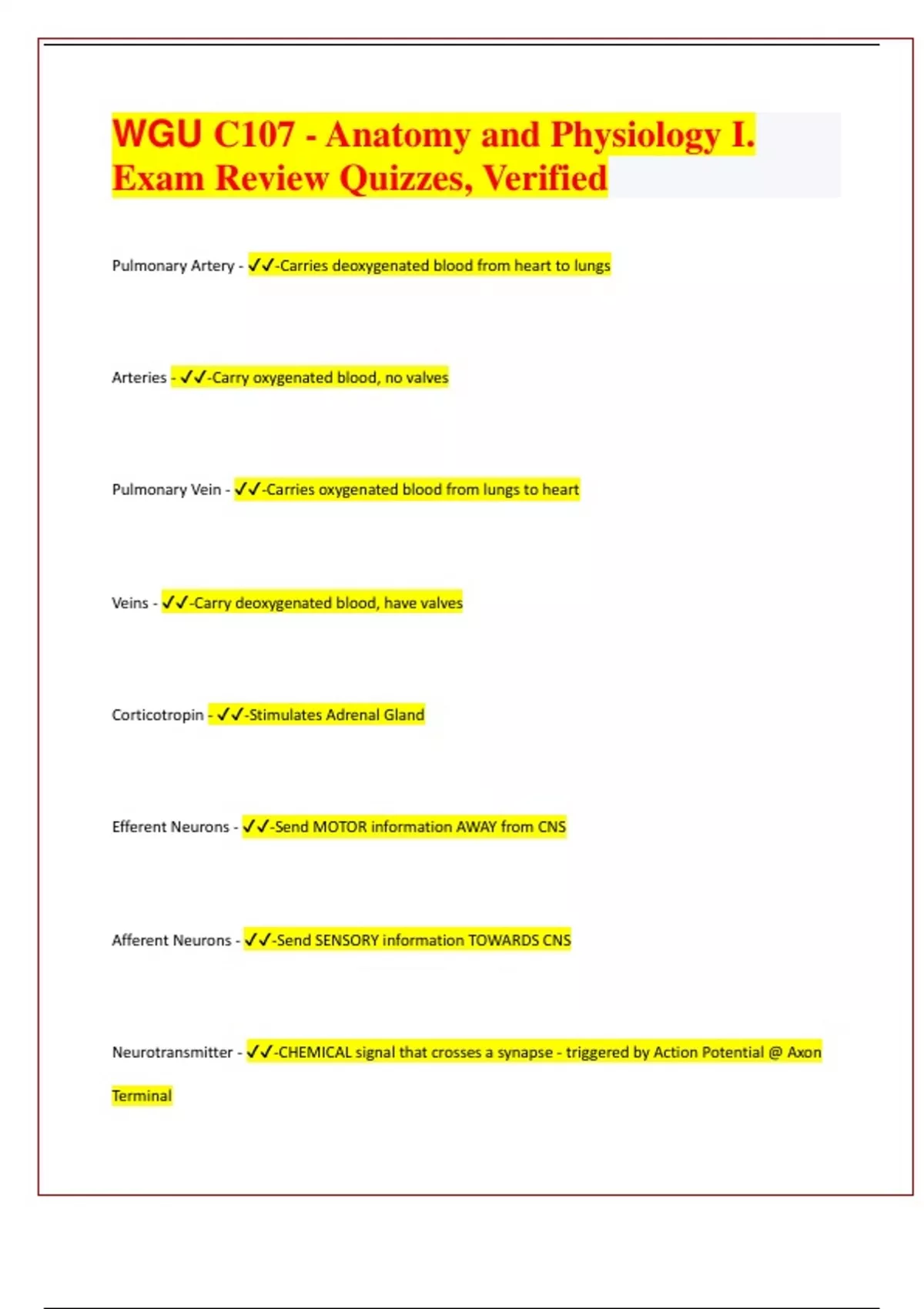 Pulmonary Artery - -Carries deoxygenated blood from heart to lungs Arteries - -Carry oxygenated blood, no valves Pulmonary Vein - -Carries oxygenated blood from lungs to heart Veins - -Carry deoxygenated blood, have valves Corticotropin - -Stimulates Adrenal Gland Efferent Neurons - -Send MOTOR information AWAY from CNS Afferent Neurons - -Send SENSORY information TOWARDS CNS