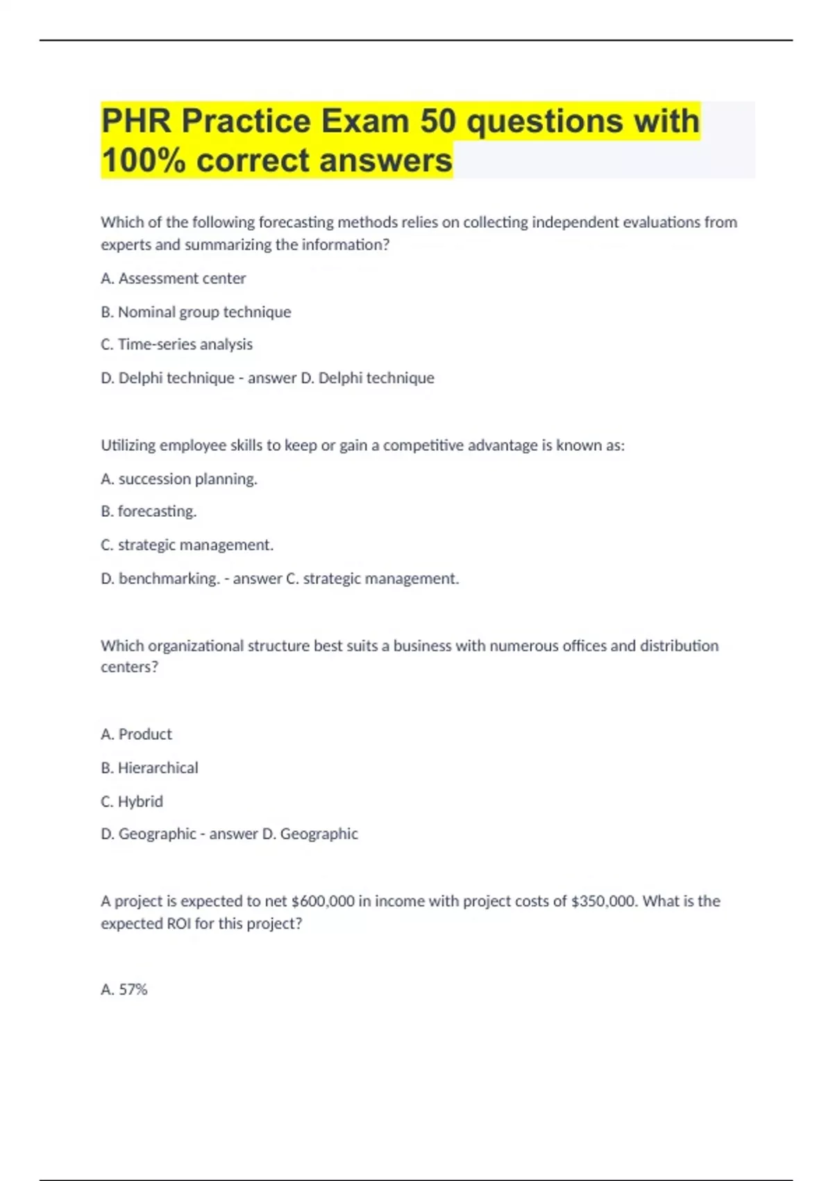 PHR Practice Test Questions with 100% correct answers.