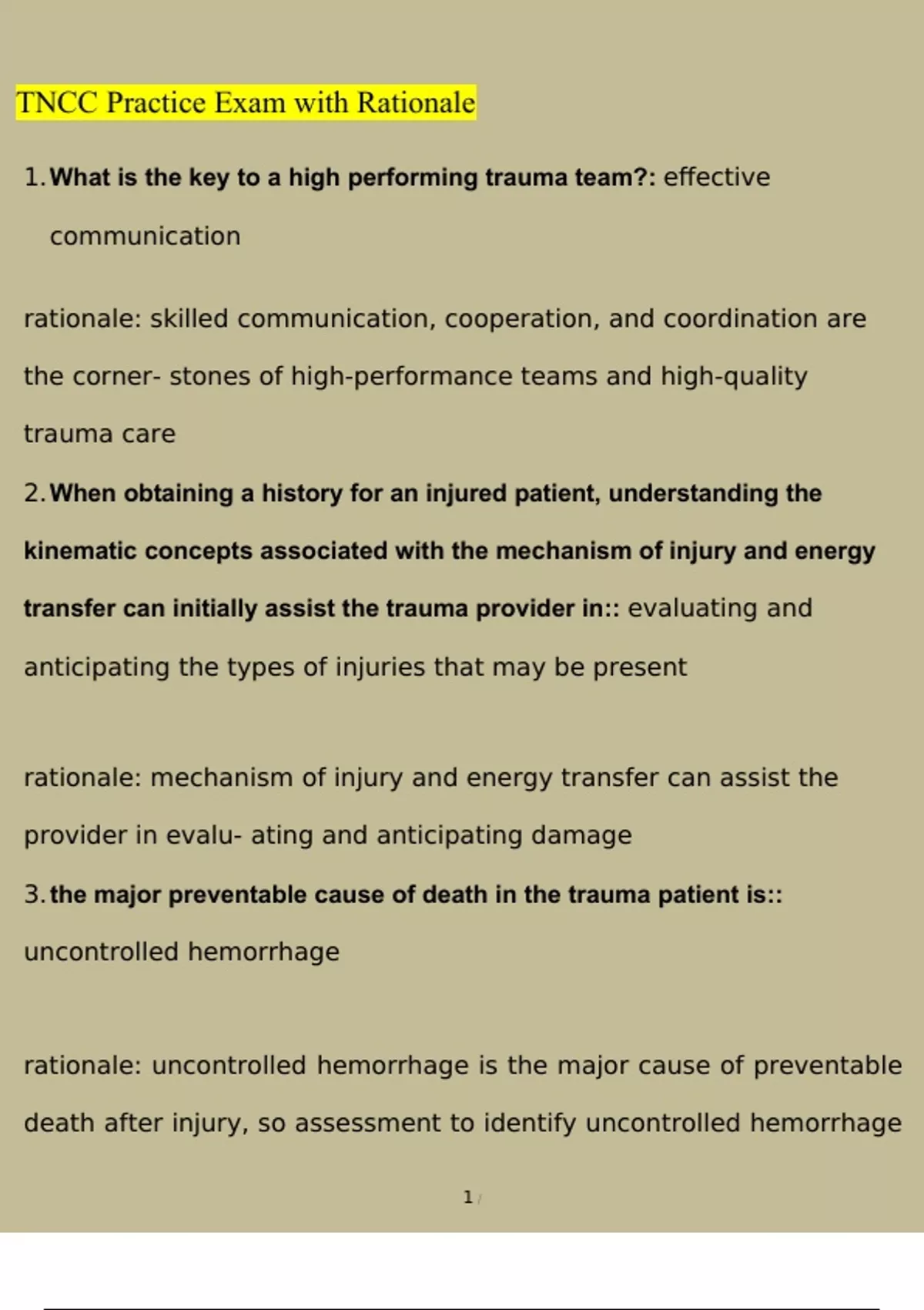 TNCC Practice Exam with Rationale Questions and Answers Latest (2023 / 2024) (Verified Answers)