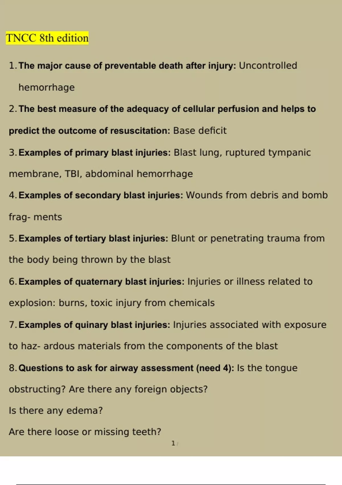 TNCC 8th edition Questions and Answers Latest (2023 / 2024) (Verified Answers)