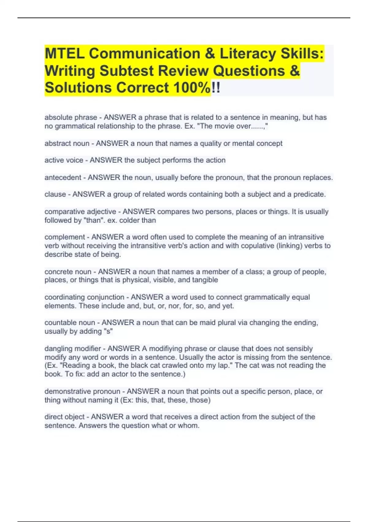 MTEL Communication & Literacy Skills: Writing Subtest Review Questions & Solutions Correct 100%!!
