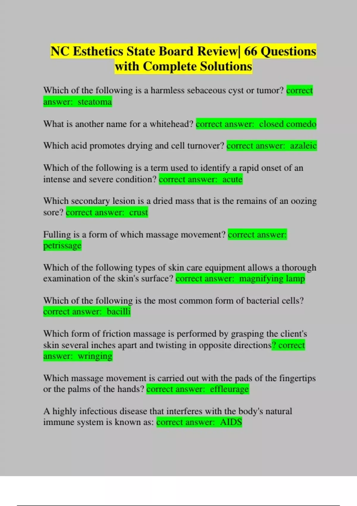 NC Esthetics State Board Review| 66 Questions with Complete Solutions Which of the following is a harmless sebaceous cyst or tumor? correct answer: steatoma What is another name for a whitehead? correct answer: closed comedo Which acid promotes drying and cell turnover? correct answer: azaleic Which of the following is a term used to identify a rapid onset of an intense and severe condition? correct answer: acute Which secondary lesion is a dried mass that is the remains of an oozing sore? correct answer: crust Fulling is a form of which massage movement? correct answer: petrissage Which of the following types of skin care equipment allows a thorough examination of the skin's surface? correct answer: magnifying lamp Which of the following is the most common form of bacterial cells? correct answer: bacilli Which form of friction massage is performed by grasping the client's skin several inches apart and twisting in opposite directions? correct answer: wringing Which massage movement is carried out with the pads of the fingertips or the palms of the hands? correct answer: effleurage A highly infectious disease that interferes with the body's natural immune system is known as: correct answer: AIDS What machine is used to sterilize surgical instruments with high- pressure and high-temperature vapors? correct answer: chemiclave What massage movement includes chucking and wringing on the arms and body? correct answer: friction What are organisms that grow and feed on other living organisms called? correct answer: external parasites What item should be used on tools and implements that have not come in contact with blood or body fluids? correct answer: broad-spectrum disinfectant Which of the following is probably the most important of the massage movements? correct answer: petrissage Which of the following is NOT a characteristic of rosacea? correct answer: thin crepe-like skin Which of the following is NOT a disease that is both infectious and contagious? correct answer: Hepatitis B Which of the following massage movements uses a circular or wringing movement with no gliding? correct answer: friction When performing a facial treatment on a male client, all movements on the beard area should be made in which of the following directions? correct answer: downward Which of the products listed below assists in preventing the growth of bacteria on the skin? correct answer: antiseptic