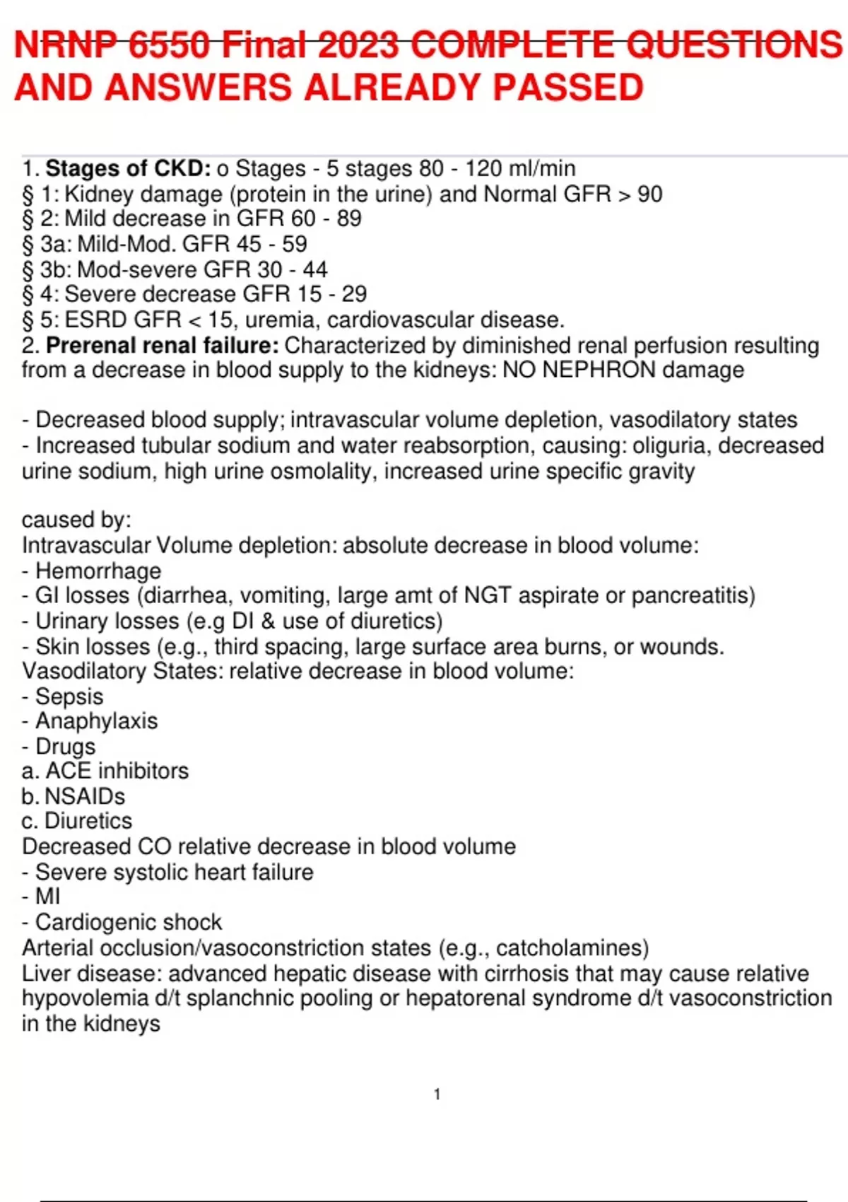 1. Stages of CKD: o Stages - 5 stages 80 - 120 ml/min § 1: Kidney damage (protein in the urine) and Normal GFR > 90 § 2: Mild decrease in GFR 60 - 89 § 3a: Mild-Mod. GFR 45 - 59 § 3b: Mod-severe GFR 30 - 44 § 4: Severe decrease GFR 15 - 29 § 5: ESRD GFR < 15, uremia, cardiovascular disease. 2. Prerenal renal failure: Characterized by diminished renal perfusion resulting from a decrease in blood supply to the kidneys: NO NEPHRON damage - Decreased blood supply; intravascular volume depletion, vasodilatory states - Increased tubular sodium and water reabsorption, causing: oliguria, decreased urine sodium, high urine osmolality, increased urine specific gravity caused by: Intravascular Volume depletion: absolute decrease in blood volume: - Hemorrhage - GI losses (diarrhea, vomiting, large amt of NGT aspirate or pancreatitis) - Urinary losses (e.g DI & use of diuretics) - Skin losses (e.g., third spacing, large surface area burns, or wounds. Vasodilatory States: relative decrease in blood volume: - Sepsis - Anaphylaxis - Drugs a. ACE inhibitors b. NSAIDs c. Diuretics Decreased CO relative decrease in blood volume - Severe systolic heart failure - MI - Cardiogenic shock Arterial occlusion/vasoconstriction states (e.g., catcholamines) Liver disease: advanced hepatic disease with cirrhosis that may cause relative hypovolemia d/t splanchnic pooling or hepatorenal syndrome d/t vasoconstriction in the kidneys