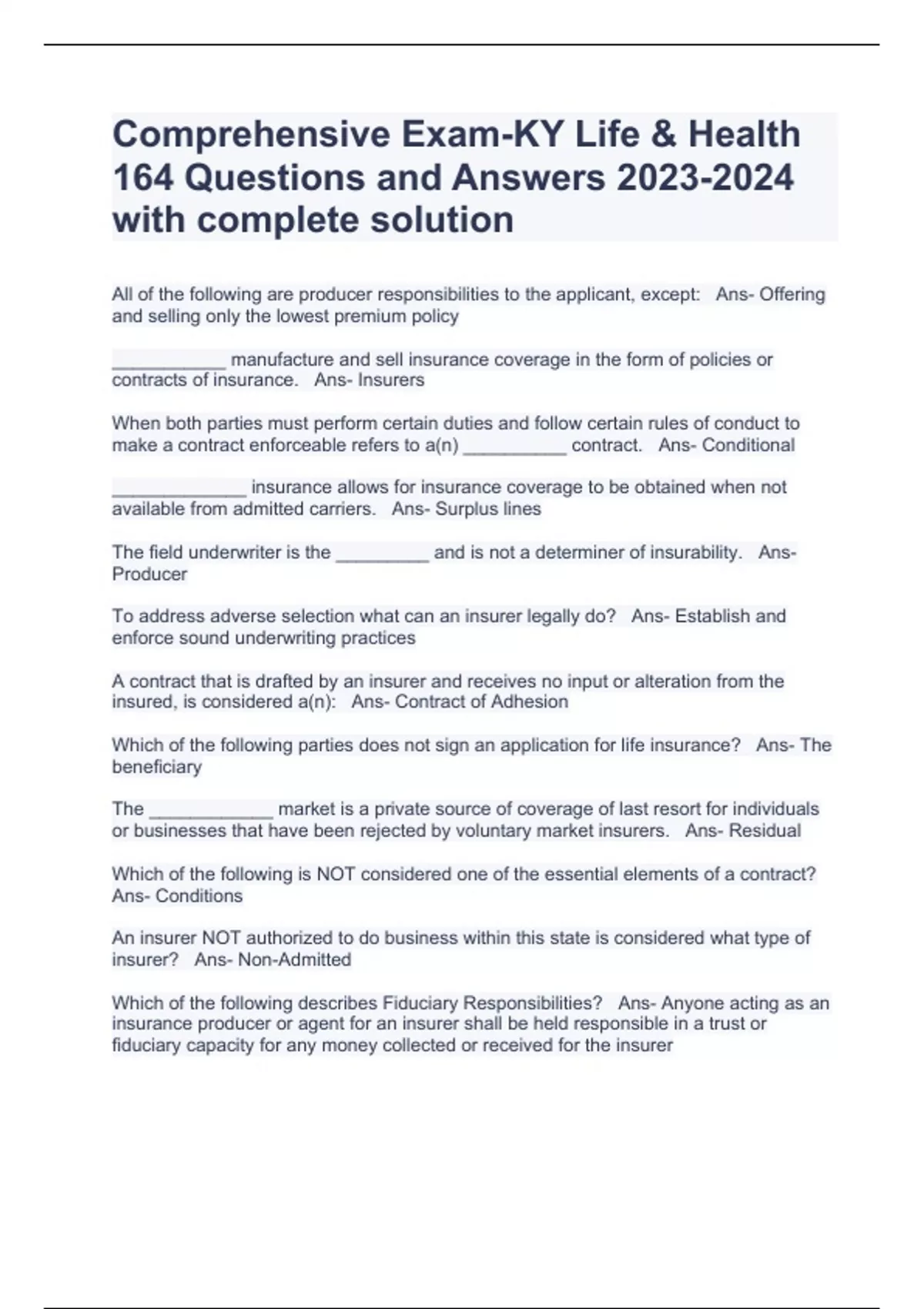 Comprehensive Exam-KY Life & Health 164 Questions and Answers with complete solution