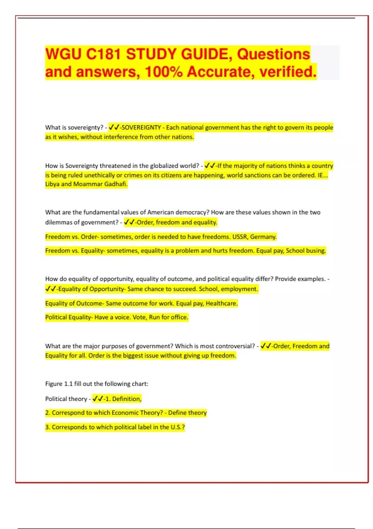 What is sovereignty? - -SOVEREIGNTY - Each national government has the right to govern its people as it wishes, without interference from other nations. How is Sovereignty threatened in the globalized world? - -If the majority of nations thinks a country is being ruled unethically or crimes on its citizens are happening, world sanctions can be ordered. IE... Libya and Moammar Gadhafi. What are the fundamental values of American democracy? How are these values shown in the two dilemmas of government? - -Order, freedom and equality. Freedom vs. Order- sometimes, order is needed to have freedoms. USSR, Germany. Freedom vs. Equality- sometimes, equality is a problem and hurts freedom. Equal pay, School busing. How do equality of opportunity, equality of outcome, and political equality differ? Provide examples. - -Equality of Opportunity- Same chance to succeed. School, employment. Equality of Outcome- Same outcome for work. Equal pay, Healthcare. Political Equality- Have a voice. Vote, Run for office. What are the major purposes of government? Which is most controversial? - -Order, Freedom and Equality for all. Order is the biggest issue without giving up freedom. Figure 1.1 fill out the following chart: Political theory - -1. Definition, 2. Correspond to which Economic Theory? - Define theory 3. Corresponds to which political label in the U.S.?