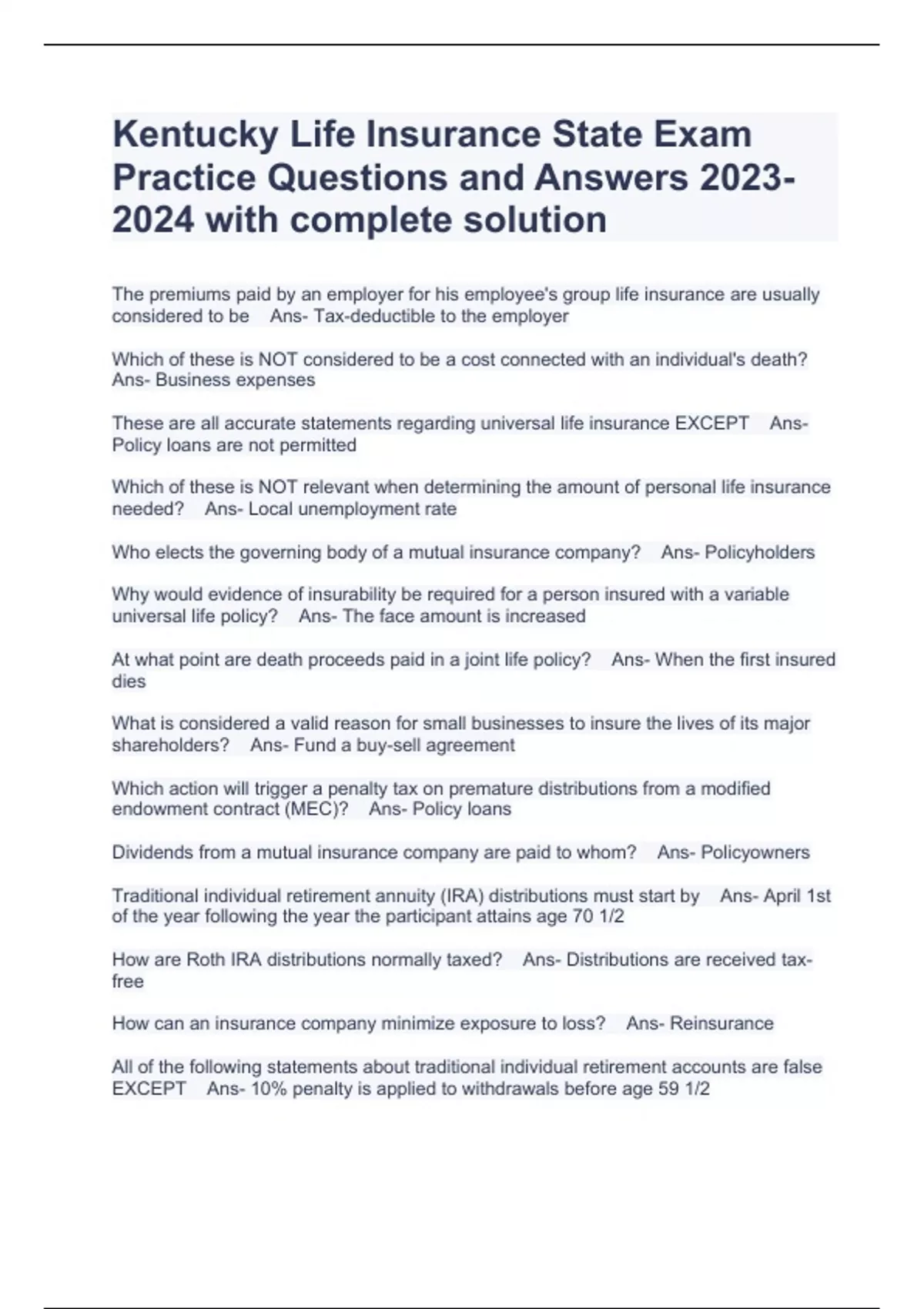 Kentucky Life Insurance State Exam Practice Questions and Answers with complete solution