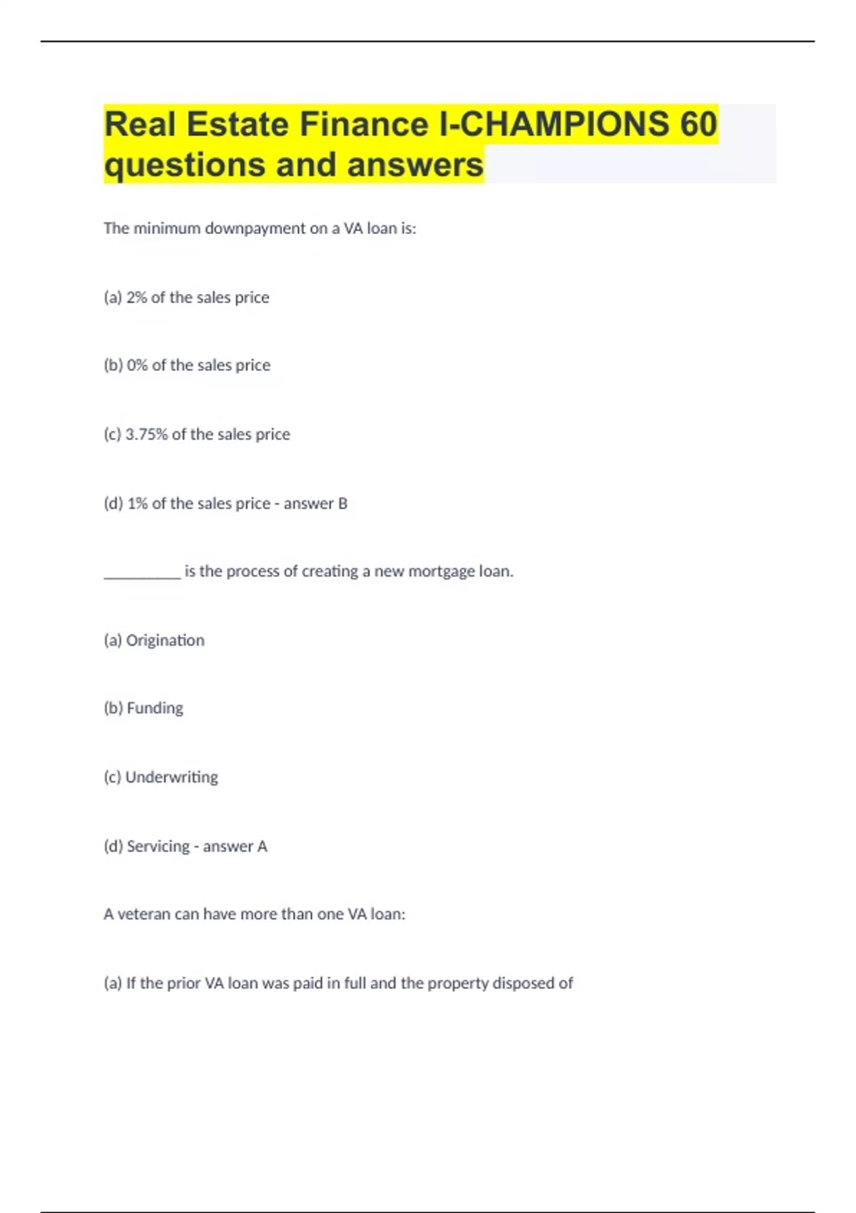 Real Estate Finance I-CHAMPIONS| 60 questions and answers