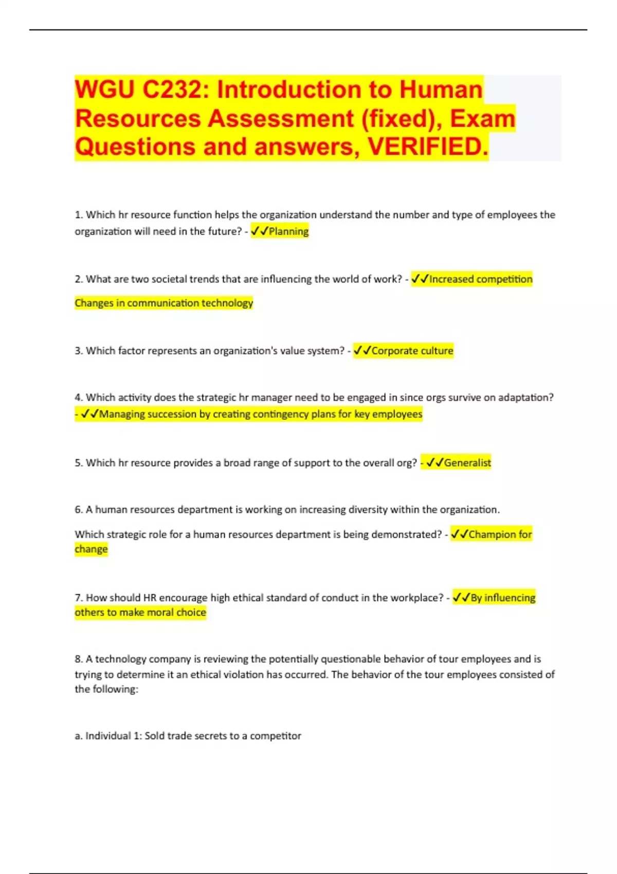 WGU C232: Introduction to Human Resources Assessment (fixed), Exam Questions and answers, VERIFIED 2024