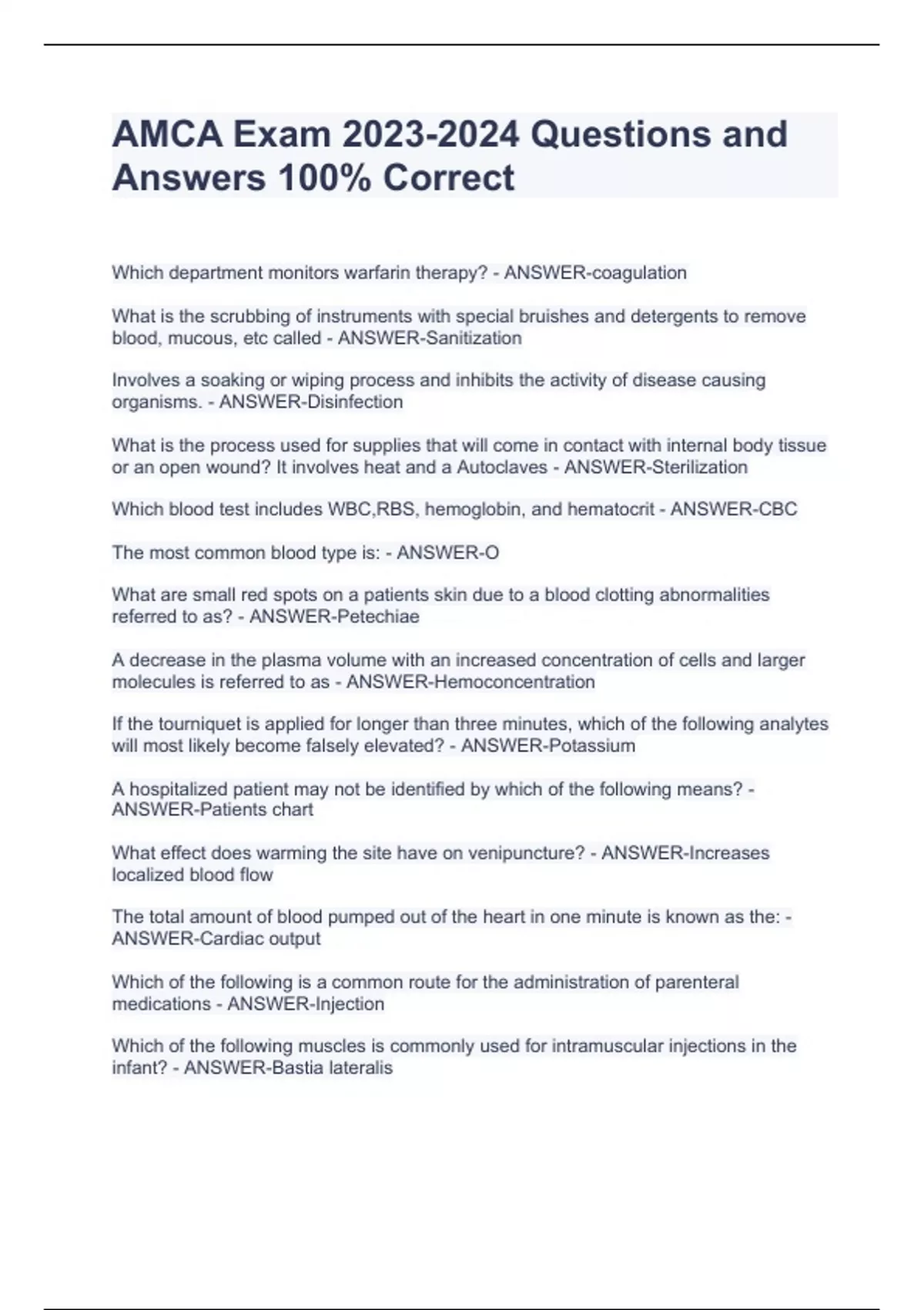 AMCA Exam Questions and Answers 100% CorrectAMCA Exam Questions and Answers 100% CorrectAMCA Exam Questions and Answers 100% CorrectAMCA Exam Questions and Answers 100% Correct Which department monitors warfarin therapy? - ANSWER-coagulation What is the scrubbing of instruments with special bruishes and detergents to remove blood, mucous, etc called - ANSWER-Sanitization Involves a soaking or wiping process and inhibits the activity of disease causing organisms. - ANSWER-Disinfection