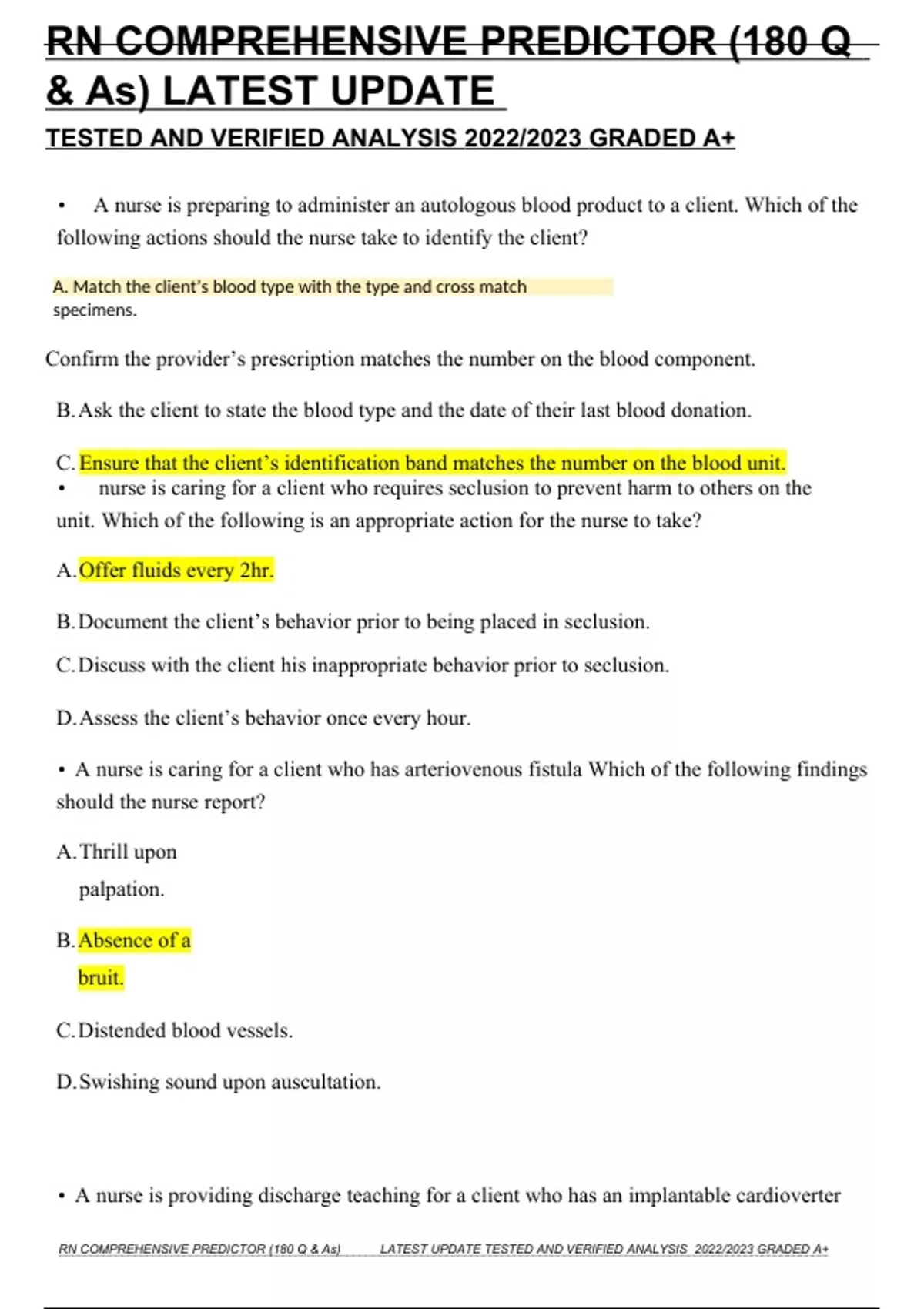 A nurse is preparing to administer an autologous blood product to a client. Which of the following actions should the nurse take to identify the client? Confirm the provider’s prescription matches the number on the blood component. Ask the client to state the blood type and the date of their last blood donation. Ensure that the client’s identification band matches the number on the blood unit. nurse is caring for a client who requires seclusion to prevent harm to others on the unit. Which of the following is an appropriate action for the nurse to take? Offer fluids every 2hr. Document the client’s behavior prior to being placed in seclusion. Discuss with the client his inappropriate behavior prior to seclusion. Assess the client’s behavior once every hour. A nurse is caring for a client who has arteriovenous fistula Which of the following findings should the nurse report? Thrill upon palpation. Absence of a bruit. Distended blood vessels. Swishing sound upon auscultation. A nurse is providing discharge teaching for a client who has an implantable cardioverter defibrillator which of the following statements demonstrates