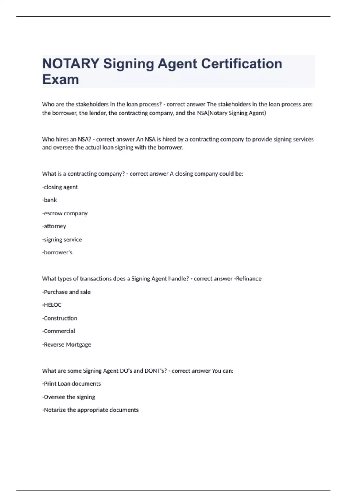 NOTARY Signing Agent Certification ExamWho are the stakeholders in the loan process? - correct answer The stakeholders in the loan process are: the borrower, the lender, the contracting company, and the NSA(Notary Signing Agent) Who hires an NSA? - correct answer An NSA is hired by a contracting company to provide signing services and oversee the actual loan signing with the borrower. What is a contracting company? - correct answer A closing company could be: -closing agent -bank -escrow company -attorney -signing service -borrower's What types of transactions does a Signing Agent handle? - correct answer -Refinance -Purchase and sale -HELOC -Construction -Commercial -Reverse Mortgage What are some Signing Agent DO's and DONT's? - correct answer You can: -Print Loan documents -Oversee the signing -Notarize the appropriate documents -Return the documents You can't: -Process loans -Conduct a settlement -Prepare documents -Offer am opinion or legal advice to the borrowers What are some examples of discriminatory or unfair practices? - correct answer -refusing to perform signing or providing inferior services based on clients race, color, national origin, religion, gender, sexual orientation, disability, family or migratory status -making unprofessional and insensitive remarks about the clients culture, level of education or lifestyle -Prompting the perception of unwelcome advances or a lewd act Where does the NSA fit in the loan process? - correct answer You may be the first or the only person the borrower meets. Although you are involved in only one step, the whole loan process hinges on how well you do your job. What are the key responsibilities of a Signing Agent? - correct answer Key responsibilities: -Travel to the borrower -Oversee the Signing -Collect stipulations and notarize applicable documents -Ensure that the documents are signed, dated or initialed properly -Review all the documents -Return the documents to the contracting company. How does a Signing Agent's performance affect the SLA(Service Level Agreement)? - correct answer Your poor performance can negatively affect the payment to the contracting company How can a Signing Agent provide superior customer service - correct answer You can: