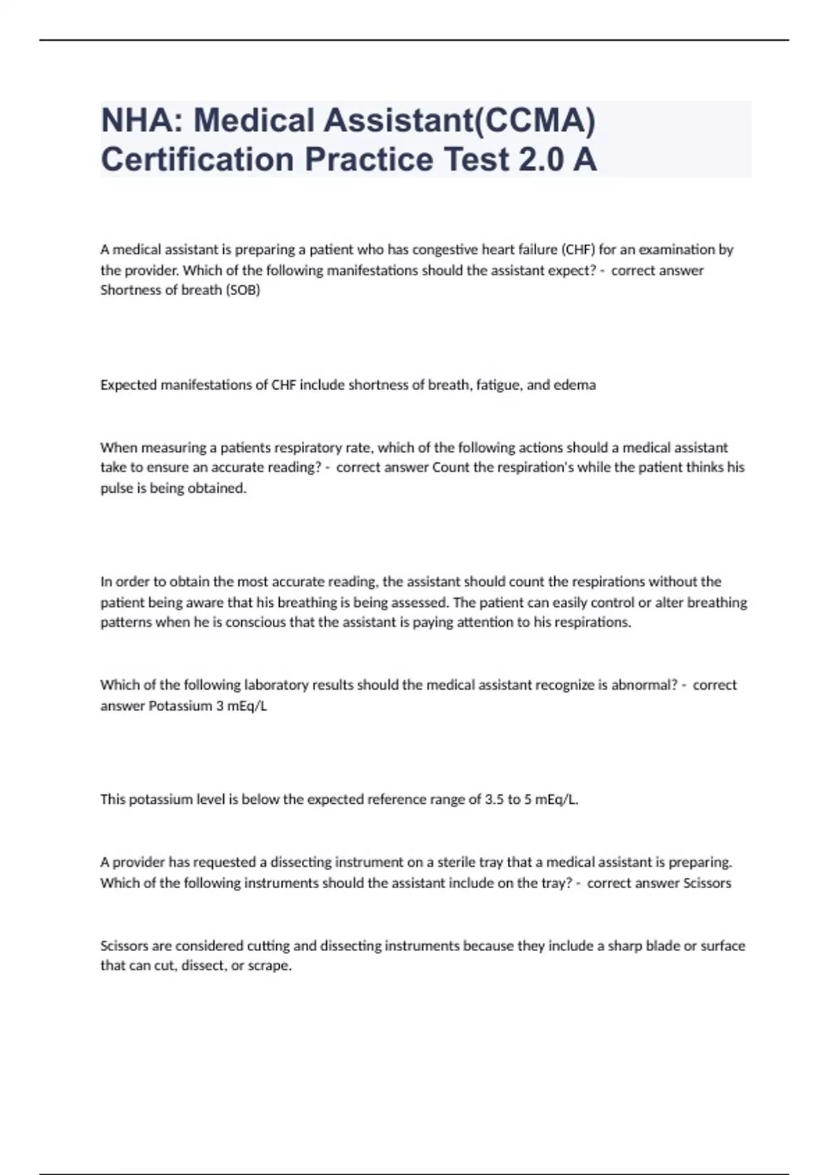 NHA Medical Assistant(CCMA) Certification Practice Test 2.0 AA medical assistant is preparing a patient who has congestive heart failure (CHF) for an examination by the provider. Which of the following manifestations should the assistant expect? - correct answer Shortness of breath (SOB) Expected manifestations of CHF include shortness of breath, fatigue, and edema When measuring a patients respiratory rate, which of the following actions should a medical assistant take to ensure an accurate reading? - correct answer Count the respiration's while the patient thinks his pulse is being obtained. In order to obtain the most accurate reading, the assistant should count the respirations without the patient being aware that his breathing is being assessed. The patient can easily control or alter breathing patterns when he is conscious that the assistant is paying attention to his respirations. Which of the following laboratory results should the medical assistant recognize is abnormal? - correct answer Potassium 3 mEq/L This potassium level is below the expected reference range of 3.5 to 5 mEq/L. A provider has requested a dissecting instrument on a sterile tray that a medical assistant is preparing. Which of the following instruments should the assistant include on the tray? - correct answer Scissors Scissors are considered cutting and dissecting instruments because they include a sharp blade or surface that can cut, dissect, or scrape. A medical assistant is replacing a sharps container in an examination room and receives a small laceration on her arm from the plastic lid. Which of the following types of documentation should the assistant complete as a result of this incident? - correct answer OSHA Form 301 The assistant should recognize that the OSHA Form 301 is an incident report used when reporting details about a work-related injury or illness. A medical assistant is reviewing a patient's history prior to the patient's appointment. Which of the following laboratory results indicates the need to schedule an extension of the current visit? - correct answer Fasting blood glucose 168 mg/dL This fasting blood glucose level is above the expected reference range of 70 to 130 mg/dL. The assistant should notify the provider and schedule an extension of the patient's visit. A medical assistant is reinforcing instructions with a patient about how to take a buccal of the following instructions should the assistant give the patient? - correct answer "Place the tablet between you or gums and cheek." The assistant should instruct the patient to place the buccal tablet between his gums and his cheek. A buccal tablet acts faster than oral tablets because it does not need to pass through the gastrointestinal tract to be absorbed. Which of the following terms should a medical assistant use to tell a provider that a patient is having discomfort and difficulty breathing? - correct answer Dyspnea Dyspnea is a term used to indicate that a patient is experiencing difficult or painful breathing.