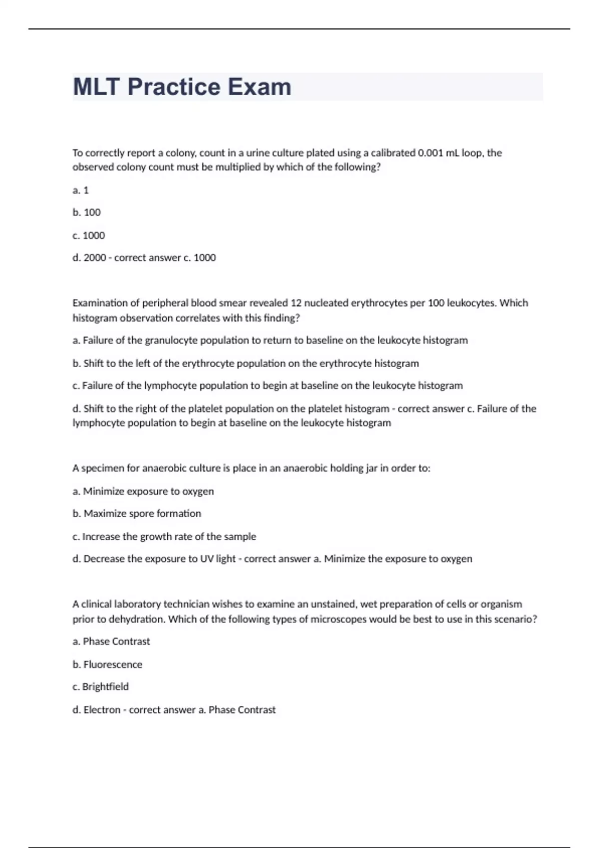 MLT Practice Exam To correctly report a colony, count in a urine culture plated using a calibrated 0.001 mL loop, the observed colony count must be multiplied by which of the following? a. 1 b. 100 c. 1000 d. 2000 - correct answer c. 1000 Examination of peripheral blood smear revealed 12 nucleated erythrocytes per 100 leukocytes. Which histogram observation correlates with this finding? a. Failure of the granulocyte population to return to baseline on the leukocyte histogram b. Shift to the left of the erythrocyte population on the erythrocyte histogram c. Failure of the lymphocyte population to begin at baseline on the leukocyte histogram d. Shift to the right of the platelet population on the platelet histogram - correct answer c. Failure of the lymphocyte population to begin at baseline on the leukocyte histogram A specimen for anaerobic culture is place in an anaerobic holding jar in order to: a. Minimize exposure to oxygen b. Maximize spore formation c. Increase the growth rate of the sample d. Decrease the exposure to UV light - correct answer a. Minimize the exposure to oxygen A clinical laboratory technician wishes to examine an unstained, wet preparation of cells or organism prior to dehydration. Which of the following types of microscopes would be best to use in this scenario? a. Phase Contrast b. Fluorescence c. Brightfield d. Electron - correct answer a. Phase Contrast An organism gives the following reactions: TSI and KIA alkaline slant over an acid butt, H2S positive ferments glucose. Based on these reactions, what is the most likely identification of the organism? a. Proteus mirabilis b. Esherichia coli c. Pseudomonas aeruginosa d. Salmonella sp. - correct answer a. Proteus mirabilis A pregnant woman who has active syphillis and a RPR of 1:32 is being treated with penicillin. She gives birth to a baby boy. When the cord blood from the baby is tested, the RPR is 1:2. Based on the above data, the most likely interpretation is: a. The baby has congenital syphillis b. The baby does not have syphillis. A titer this low represents passive acquisition of the antibody from the mother c. The baby does not have syphillis. A titer this low represents a biological false positive d. No definitive conclusion can be made from this data. Further testing is necessary - correct answer D.No definitive conclusion can be made from this data. Further testing is necessary Which of the following potential donors would be acceptable for donation of whole blood? a. An individual who had a tattoo applied b. A phlebotomist with a reported needle stick injury 10 months ago c. An individual who has just immigrated to U.S. from Great Britain d. An 18-year old male taking antibiotics for a severe case of acne - correct answer d.An 18-year old male taking antibiotics for a severe case of acne An organism from a lung biopsy grew as mould at room temperature and a yeast at 37C. what is the most appropriate way to interpret these results? a. Specimen is contaminated, ask for repeat collection b. Dimorphic fungus present c. Two organisms are present but only the mould is significant d. Two pathogens are present - correct answer b.Dimorphic fungus present In a serological serial dilution, if tube 1 has 1mL of an undiluted specimen and doubling dilutions are used thereafter, what is the dilution in tube 10? a. 1:200 b. 1:500 c. 1:512 d. 1:1024 - correct answer c.1:512 Infectious mononucleosis exhibits what serological reaction below when serum from an actively infected patient is tested? a. Agglutination of guinea pig kidney cells after absorption of the serum specimen with horse red blood cells b. Agglutination of beef red blood cells after absorption of the serum specimen with horse red blood cells c. Agglutination of horse red blood cells after absorption of the serum specimen by guinea pig kidney cells d. Agglutination of horse red blood cells after absorption of the serum specimen by beef red blood cells - correct answer c.Agglutination of horse red blood cells after absorption of the serum specimen by guinea pig kidney cells Proficiency testing should be performed by: a. All personal who routinely perform the procedure b. Individuals on the day shift c. Section supervisors d. Newer personal whose performance requires monitoring - correct answer a.All personal who routinely perform the procedure A DAT profile gave the following results: {Polspecific: +} {IgG:+} {C3b: 0} These results are MOST consistent with: a. Warm autoimmune hemolytic anemia b. Cold autoimmune hemolytic anemia c. Complement deficiency d. Immunosuppressant - correct answer a.Warm autoimmune hemolytic anemia A clinical laboratory technician is given an unknown sample to document proficiency in the performance of glucose testing. The clinical laboratory technician obtains a result of 195mg/dL; the control values are within the acceptable range. What should the clinical laboratory technician do? a. Report the result as 195mg/dL b. Repeat the test to confirm the result c. Ask another clinical lab technician to perform the test to confirm the result d. Dilute the sample and repeat the test - correct answer a.Report the result as 195 mg/dL A control has a mean of 2.8 with a standard deviation of 0.3 of the values obtained, 68% should fall within a range of: a. 2.2 - 3.1 b. 2.5 - 3.4 c. 2.2 - 3.4 d. 2.5 - 3.1 - correct answer d.2.5 - 3.1 A new method for measuring blood urea nitrogen (BUN) is being considered by the chemistry dept. The following data are obtained for within-run precision studies after running the abnormal level control 10 times using the new method: 45, 48, 52, 53, 57, 55, 44, 45, 46, 50. The reference range for the control is 43 to 57 mg/dL. The manufacturer claims the C.V for the new method is 5.0%. what is the calculated C.V and is this precision acceptable? a. Calculated C.V. at 4.6% is less than the manufacture's; precision is acceptable b. Calculated C.V. at 9.3% is greater than the manufacture's; precision is unacceptabl