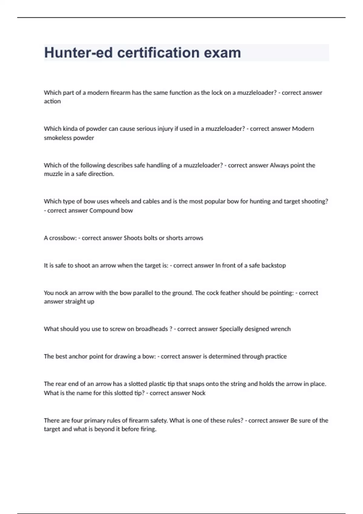 Hunter-ed certification examWhich part of a modern firearm has the same function as the lock on a muzzleloader? - correct answer action Which kinda of powder can cause serious injury if used in a muzzleloader? - correct answer Modern smokeless powder Which of the following describes safe handling of a muzzleloader? - correct answer Always point the muzzle in a safe direction. Which type of bow uses wheels and cables and is the most popular bow for hunting and target shooting? - correct answer Compound bow A crossbow: - correct answer Shoots bolts or shorts arrows It is safe to shoot an arrow when the target is: - correct answer In front of a safe backstop You nock an arrow with the bow parallel to the ground. The cock feather should be pointing: - correct answer straight up What should you use to screw on broadheads ? - correct answer Specially designed wrench The best anchor point for drawing a bow: - correct answer is determined through practice The rear end of an arrow has a slotted plastic tip that snaps onto the string and holds the arrow in place. What is the name for this slotted tip? - correct answer Nock There are four primary rules of firearm safety. What is one of these rules? - correct answer Be sure of the target and what is beyond it before firing. Which of these is one of the firearm safety rules? - correct answer Avoid alcoholic beverages before and during shooting. What have hunter education programs always taught young hunters? - correct answer Firearm and hunting safety What is true about responsible hunters? - correct answer The follow safety rules and guidelines Which group is a primary supporter of hunter education? - correct answer International Hunter Education Association-USA Within a firearm, a burning material created pressure to force the bullet or shot out of the barrel. What is this burning material? - correct answer Powder The basic components of cartridges and shotshells are similar. Shot pellets and a bullet are examples of which basic component? - correct answer Projectile What is critical when selecting the ammunition for a firearm? - correct answer Using the correct cartridge or shotshell What is the main difference between center fire and rimfire ammunition? - correct answer Rimfire primer is in the rim of the casing Choose the true statement about steel shot versus lead shot. - correct answer Steel shot weighs about one-third less than lead shot. When a rifle fired, a sequence of events takes place. After the firing pin strikes the primer, what is the next event in the sequence? - correct answer The primer explodes and ignites the gunpowder. What are the two basic styles of firearm actions? - correct answer Single-shot and repeating