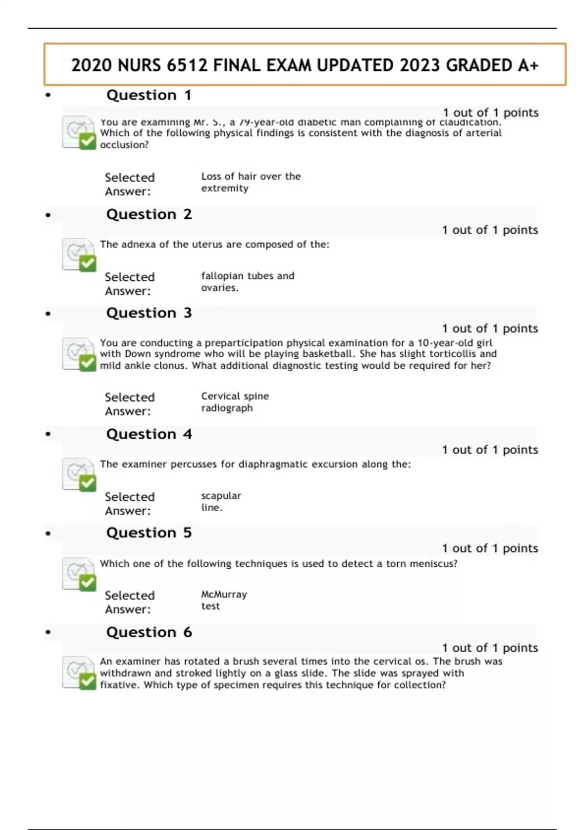2020 NURS 6512 FINAL EXAM UPDATED 2023 GRADED A+ Question 1 You are examining Mr. S., a 79-year-old diabetic man complaining of claudication. Which of the following physical findings is consistent with the diagnosis of arterial occlusion? Selected Answer: Loss of hair over the extremity Selected Answer: fallopian tubes and ovaries. Selected Answer: Cervical spine radiograph Selected Answer: scapular line. Selected Answer: McMurray test • Question 6 1 out of 1 points An examiner has rotated a brush several times into the cervical os. The brush was withdrawn and stroked lightly on a glass slide. The slide was sprayed with fixative. Which type of specimen requires this technique for collection? • Question 3 1 out of 1 points You are conducting a preparticipation physical examination for a 10-year-old girl with Down syndrome who will be playing basketball. She has slight torticollis and mild ankle clonus. What additional diagnostic testing would be required for her? 1 out of 1 points • Question 2 1 out of 1 points The adnexa of the uterus are composed of the: • Question 4 1 out of 1 points The examiner percusses for diaphragmatic excursion along the: • Question 5 1 out of 1 points Which one of the following techniques is used to detect a torn meniscus? 2020 NURS 6512 FINAL EXAM UPDATED 2023 GRADED A+ Selected Answer: Cytology smear Selected Answer: observing the infant suck and swallow. Selected Answer: Spin al Selected Answer: sensory function. Selected Answer: Raynaud disease. Selected Answer: test the six cardinal points of gaze. • Question 12 1 out of 1 points • Question 11 1 out of 1 points You are examining a patient in the emergency department who has recently sustained head trauma. In order to initially assess this patient's neurologic status, you would: • Question 9 1 out of 1 points When assessing superficial pain, touch, vibration, and position perceptions, you are testing: • Question 7 1 out of 1 points Cranial nerve XII may be assessed in an infant by: • Question 8 1 out of 1 points Which portion of the physical examination is best done with the patient standing? • Question 10 1 out of 1 points An idiopathic spasm of arterioles in the digits is termed: