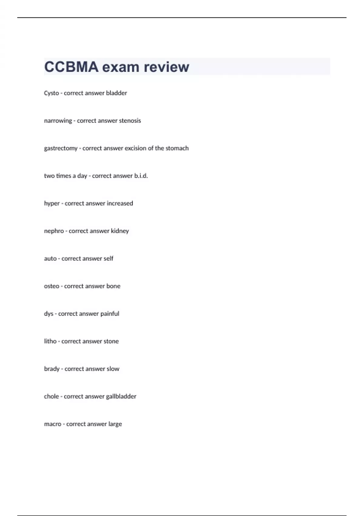 CCBMA exam review Cysto - correct answer bladder narrowing - correct answer stenosis gastrectomy - correct answer excision of the stomach two times a day - correct answer b.i.d. hyper - correct answer increased nephro - correct answer kidney auto - correct answer self osteo - correct answer bone dys - correct answer painful litho - correct answer stone brady - correct answer slow chole - correct answer gallbladder macro - correct answer large gastro - correct answer stomach arthro - correct answer joint tachy - correct answer fast thoraco - correct answer chest hemo - correct answer blood hypo - correct answer decreased mammo - correct answer breast veno - correct answer vein hepato - correct answer liver ophthalmo - correct answer eye trans - correct answer through/across oma - correct answer tumor algia - correct answer pain ectomy - correct answer surgical removal itis - correct answer inflammation ology - correct answer study emia - correct answer blood condition