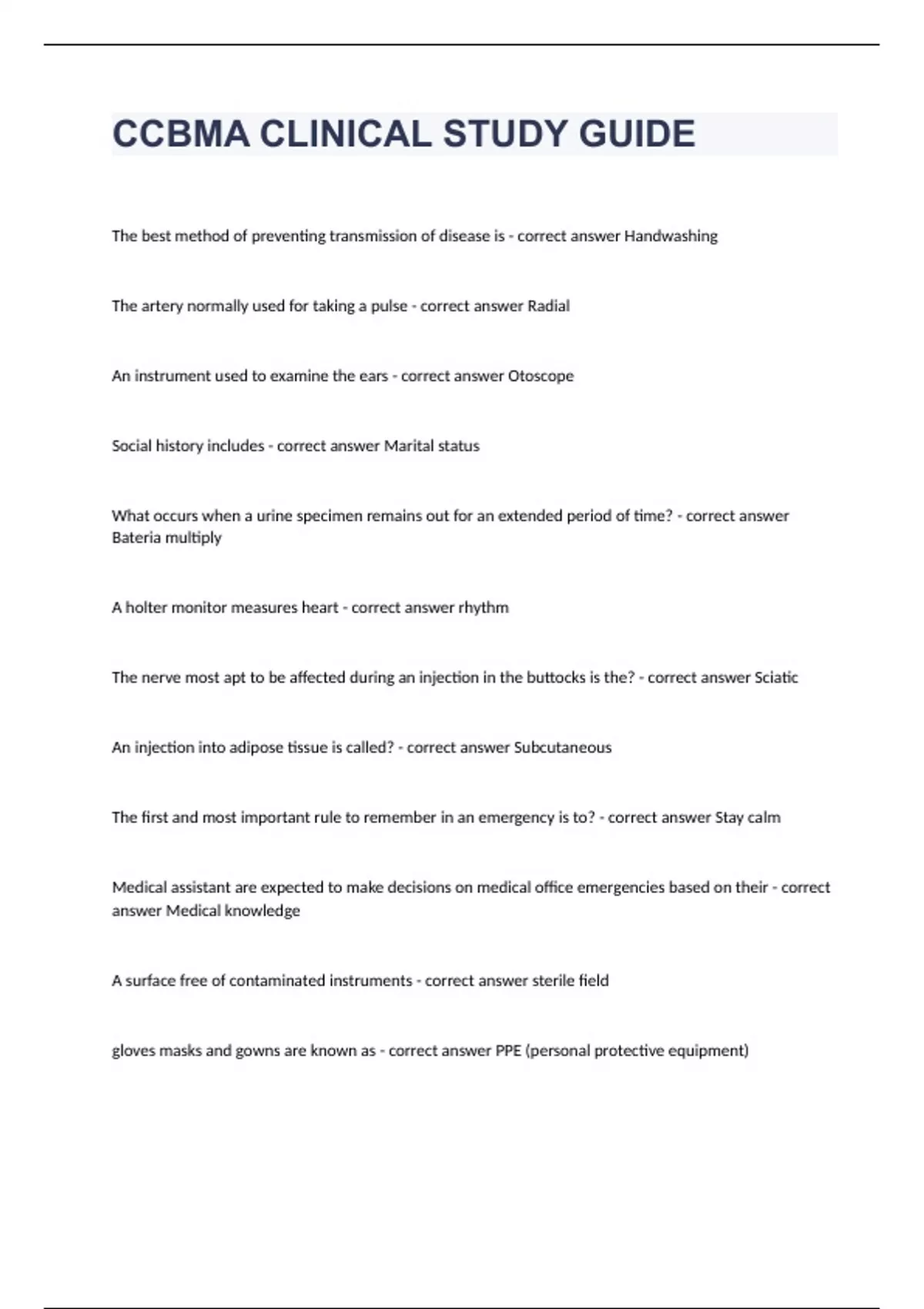 CCBMA CLINICAL STUDY GUIDEThe best method of preventing transmission of disease is - correct answer Handwashing The artery normally used for taking a pulse - correct answer Radial An instrument used to examine the ears - correct answer Otoscope Social history includes - correct answer Marital status What occurs when a urine specimen remains out for an extended period of time? - correct answer Bateria multiply A holter monitor measures heart - correct answer rhythm The nerve most apt to be affected during an injection in the buttocks is the? - correct answer Sciatic An injection into adipose tissue is called? - correct answer Subcutaneous The first and most important rule to remember in an emergency is to? - correct answer Stay calm Medical assistant are expected to make decisions on medical office emergencies based on their - correct answer Medical knowledge A surface free of contaminated instruments - correct answer sterile field gloves masks and gowns are known as - correct answer PPE (personal protective equipment) washing instruments to remove debris - correct answer sanitization Absence of bacteria - correct answer Asepsis bacteria that thrive in oxygen - correct answer aerobes An organism that produces disease - correct answer pathogen mould, yeast are types of - correct answer Fungi instruments touched by ungloved hands are - correct answer contaminated destruction of all microorgansisms - correct answer sterilization hinged instruments should be ____ when sterilized - correct answer to open A sterile pack containing scissors, thumb forceps and gauze squares is called a - correct answer Suture removal pack The term for removal of contaminated materials from a wound is - correct answer Debridement scrubbing the surgical site in a circular motion from the center of the edge is - correct answer surgical prep removing fluids or gasses by suction is called - correct answer aspiration flushing out a wound or cavity with a solution is called - correct answer Irrigation a sterile surface containing sterile items is a - correct answer surgical tray