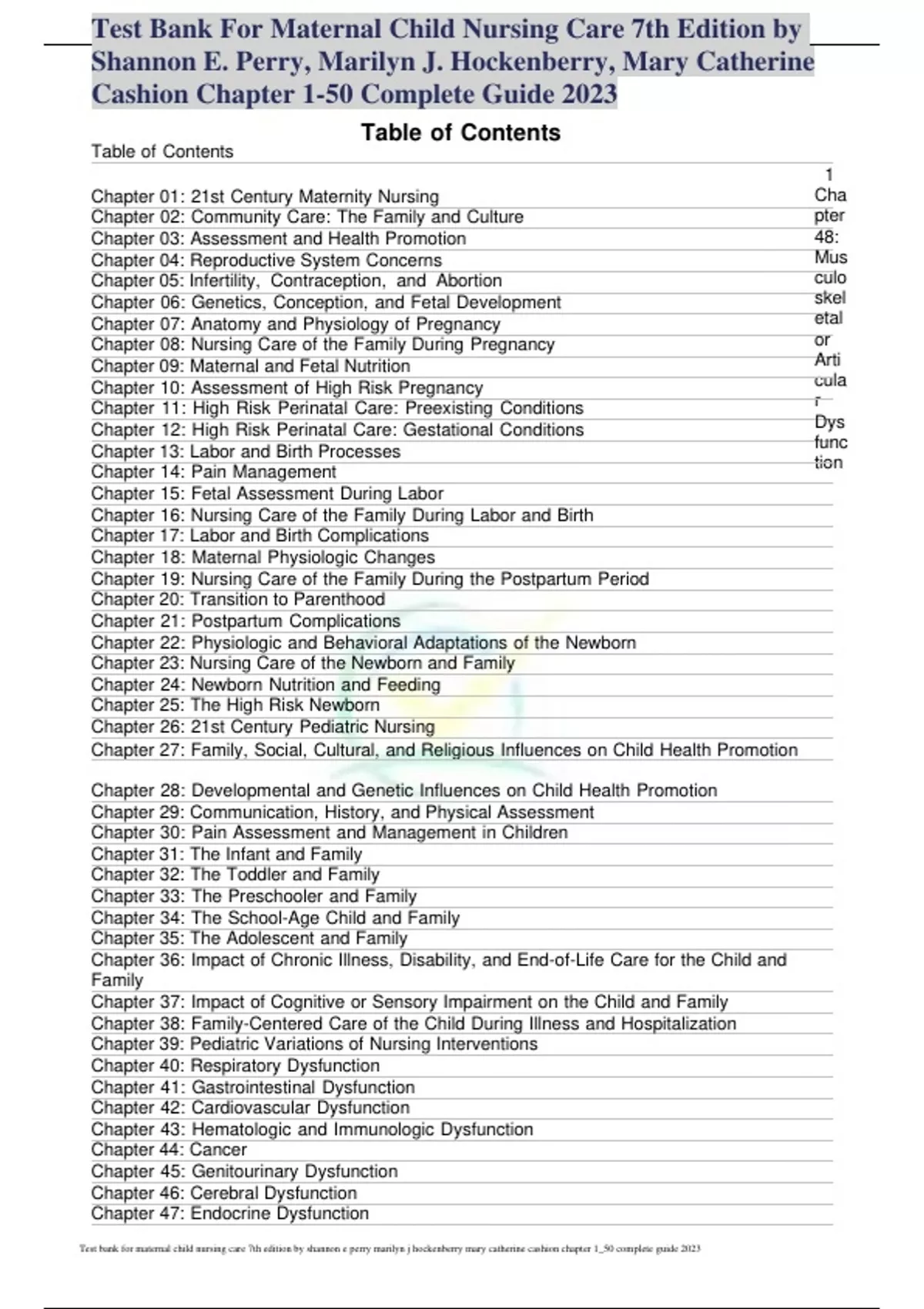 Test bank for maternal child nursing care 7th edition by shannon e perry marilyn j hockenberry mary catherine cashion chapter 1_50 complete guide 2023