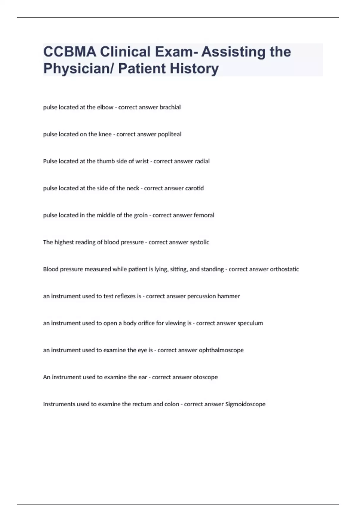 CCBMA Clinical Exam- Assisting the Physician Patient Historypulse located at the elbow - correct answer brachial pulse located on the knee - correct answer popliteal Pulse located at the thumb side of wrist - correct answer radial pulse located at the side of the neck - correct answer carotid pulse located in the middle of the groin - correct answer femoral The highest reading of blood pressure - correct answer systolic Blood pressure measured while patient is lying, sitting, and standing - correct answer orthostatic an instrument used to test reflexes is - correct answer percussion hammer an instrument used to open a body orifice for viewing is - correct answer speculum an instrument used to examine the eye is - correct answer ophthalmoscope An instrument used to examine the ear - correct answer otoscope Instruments used to examine the rectum and colon - correct answer Sigmoidoscope irregular heart rhythm - correct answer arrhythmia rapid pulse - correct answer tachycardia having no symptoms - correct answer asymptomatic slow pulse - correct answer bradycardia The artery normally used for taking a pulse - correct answer radial marital status - correct answer social history Patients own words - correct answer chief complaint family history - correct answer subjective The physician's physical examination - correct answer objective