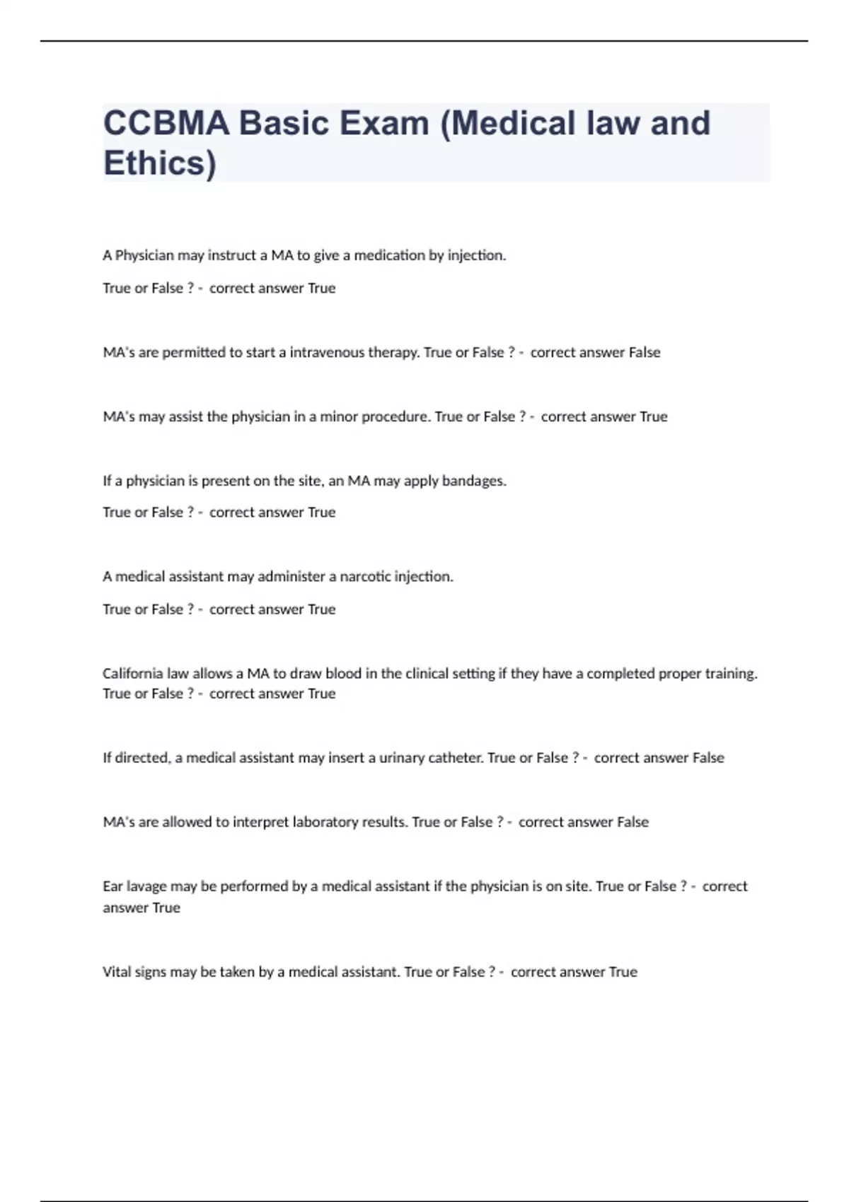 CCBMA Basic Exam (Medical law and Ethics)A Physician may instruct a MA to give a medication by injection. True or False ? - correct answer True MA's are permitted to start a intravenous therapy. True or False ? - correct answer False MA's may assist the physician in a minor procedure. True or False ? - correct answer True If a physician is present on the site, an MA may apply bandages. True or False ? - correct answer True A medical assistant may administer a narcotic injection. True or False ? - correct answer True California law allows a MA to draw blood in the clinical setting if they have a completed proper training. True or False ? - correct answer True If directed, a medical assistant may insert a urinary catheter. True or False ? - correct answer False MA's are allowed to interpret laboratory results. True or False ? - correct answer False Ear lavage may be performed by a medical assistant if the physician is on site. True or False ? - correct answer True Vital signs may be taken by a medical assistant. True or False ? - correct answer True MA's may remove orthopedic casts. True or False ? - correct answer True Injecting collagen or Botox is within the medical assistant's scope of practice. True or False ? - correct answer False Are MA's allowed to inject anesthetics. True or False ? - correct answer False Medication may be given orally by medical assistants. True or False ? - correct answer True A medical assistant is permitted to use a laser. True or False ? - correct answer False MA's may call themselves the office "nurse". True or False ? - correct answer False recommending a course of treatment for a patient is within the scope of practice. True or False ? - correct answer False If directed, a medical assistant can apply an orthopedic splint. True or False ? - correct answer False A medical assistant can remove superficial sutures. True or False ? - correct answer True MA's may perform finger sticks. True or False ? - correct answer True A physician retires without notifying his patients. The physician could be charged with? - correct answer Abandonment The disposal of medical infectious waste is controlled by? - correct answer CAL/ OSHA Regulations a physician describes a procedure, risks and alternative treatment to a patient. this is called a/an? - correct answer Informed consent