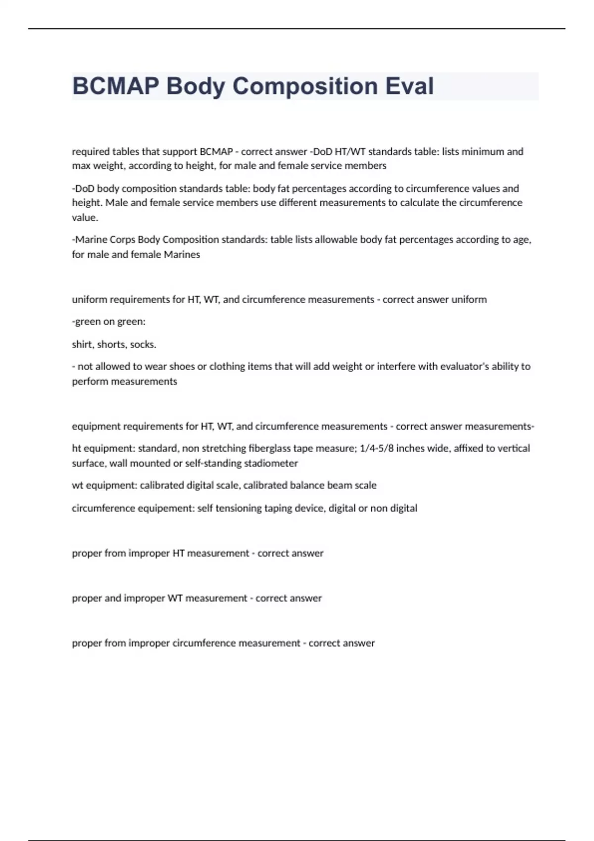 BCMAP Body Composition Evalrequired tables that support BCMAP - correct answer -DoD HT/WT standards table: lists minimum and max weight, according to height, for male and female service members -DoD body composition standards table: body fat percentages according to circumference values and height. Male and female service members use different measurements to calculate the circumference value. -Marine Corps Body Composition standards: table lists allowable body fat percentages according to age, for male and female Marines uniform requirements for HT, WT, and circumference measurements - correct answer uniform -green on green: shirt, shorts, socks. - not allowed to wear shoes or clothing items that will add weight or interfere with evaluator's ability to perform measurements equipment requirements for HT, WT, and circumference measurements - correct answer measurements- ht equipment: standard, non stretching fiberglass tape measure; 1/4-5/8 inches wide, affixed to vertical surface, wall mounted or self-standing stadiometer wt equipment: calibrated digital scale, calibrated balance beam scale circumference equipement: self tensioning taping device, digital or non digital proper from improper HT measurement - correct answer proper and improper WT measurement - correct answer proper from improper circumference measurement - correct answer
