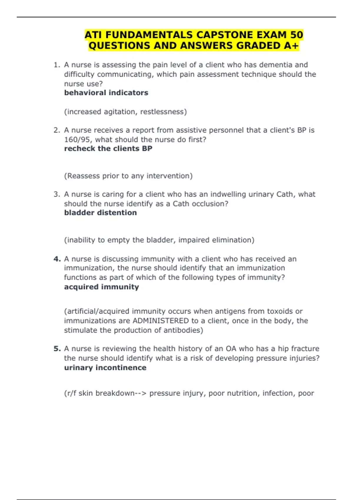 ATI FUNDAMENTALS CAPSTONE EXAM 50 QUESTIONS AND ANSWERS GRADED A+ 1. A nurse is assessing the pain level of a client who has dementia and difficulty communicating, which pain assessment technique should the nurse use? behavioral indicators (increased agitation, restlessness)