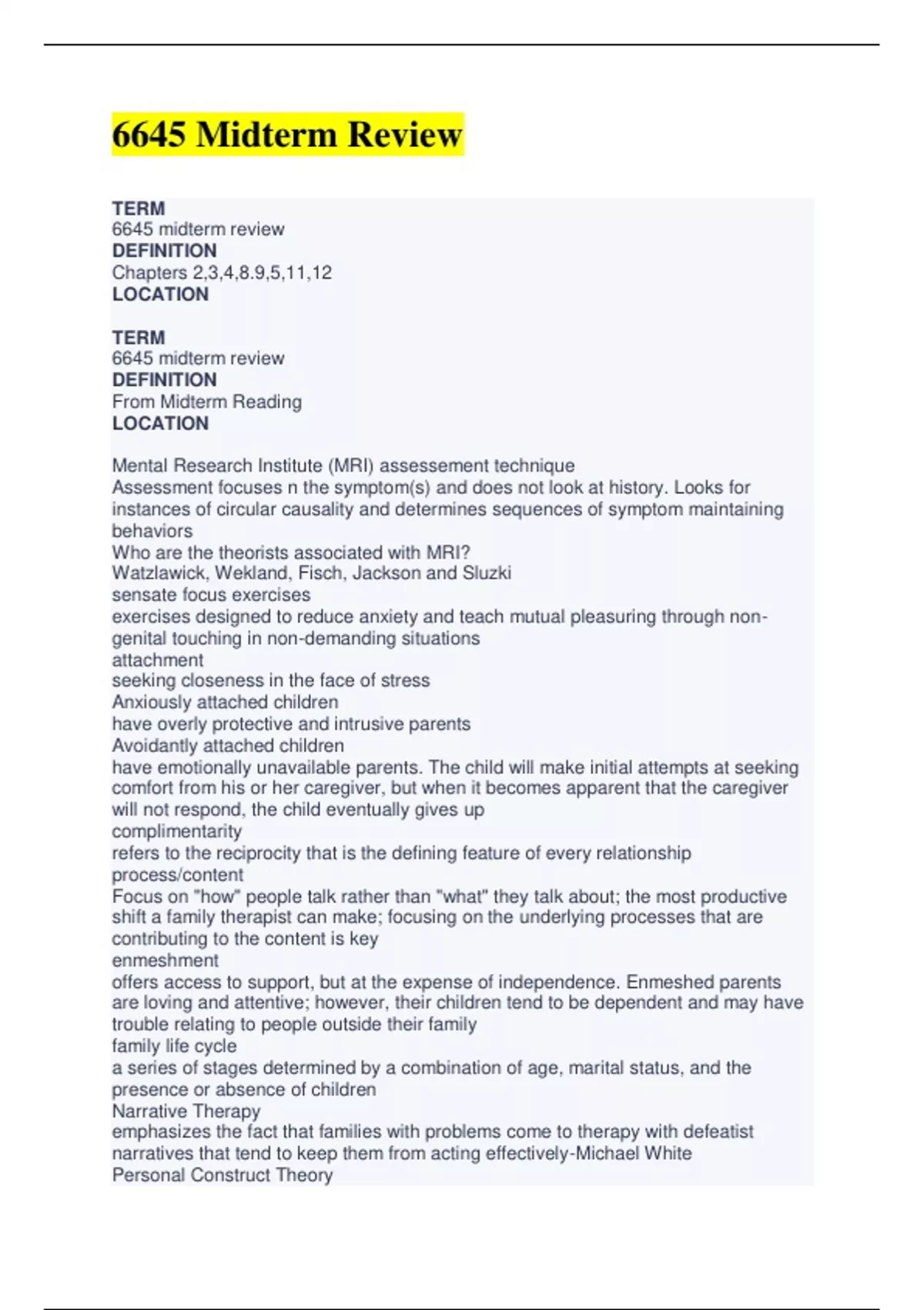 TERM 6645 midterm review DEFINITION Chapters 2,3,4,8.9,5,11,12 LOCATION TERM 6645 midterm review DEFINITION From Midterm Reading LOCATION Mental Research Institute (MRI) assessement technique Assessment focuses n the symptom(s) and does not look at history. Looks for instances of circular causality and determines sequences of symptom maintaining behaviors Who are the theorists associated with MRI? Watzlawick, Wekland, Fisch, Jackson and Sluzki sensate focus exercises exercises designed to reduce anxiety and teach mutual pleasuring through nongenital touching in non-demanding situations attachment seeking closeness in the face of stress Anxiously attached children have overly protective and intrusive parents Avoidantly attached children have emotionally unavailable parents. The child will make initial attempts at seeking comfort from his or her caregiver, but when it becomes apparent that the caregiver will not respond, the child eventually gives up complimentarity refers to the reciprocity that is the defining feature of every relationship process/content Focus on "how" people talk rather than "what" they talk about; the most productive shift a family therapist can make; focusing on the underlying processes that are contributing to the content is key enmeshment offers access to support, but at the expense of independence. Enmeshed parents are loving and attentive; however, their children tend to be dependent and may have trouble relating to people outside their family family life cycle a series of stages determined by a combination of age, marital status, and the presence or absence of children Narrative Therapy emphasizes the fact that families with problems come to therapy with defeatist narratives that tend to keep them from acting effectively-Michael White Personal Construct Theory
