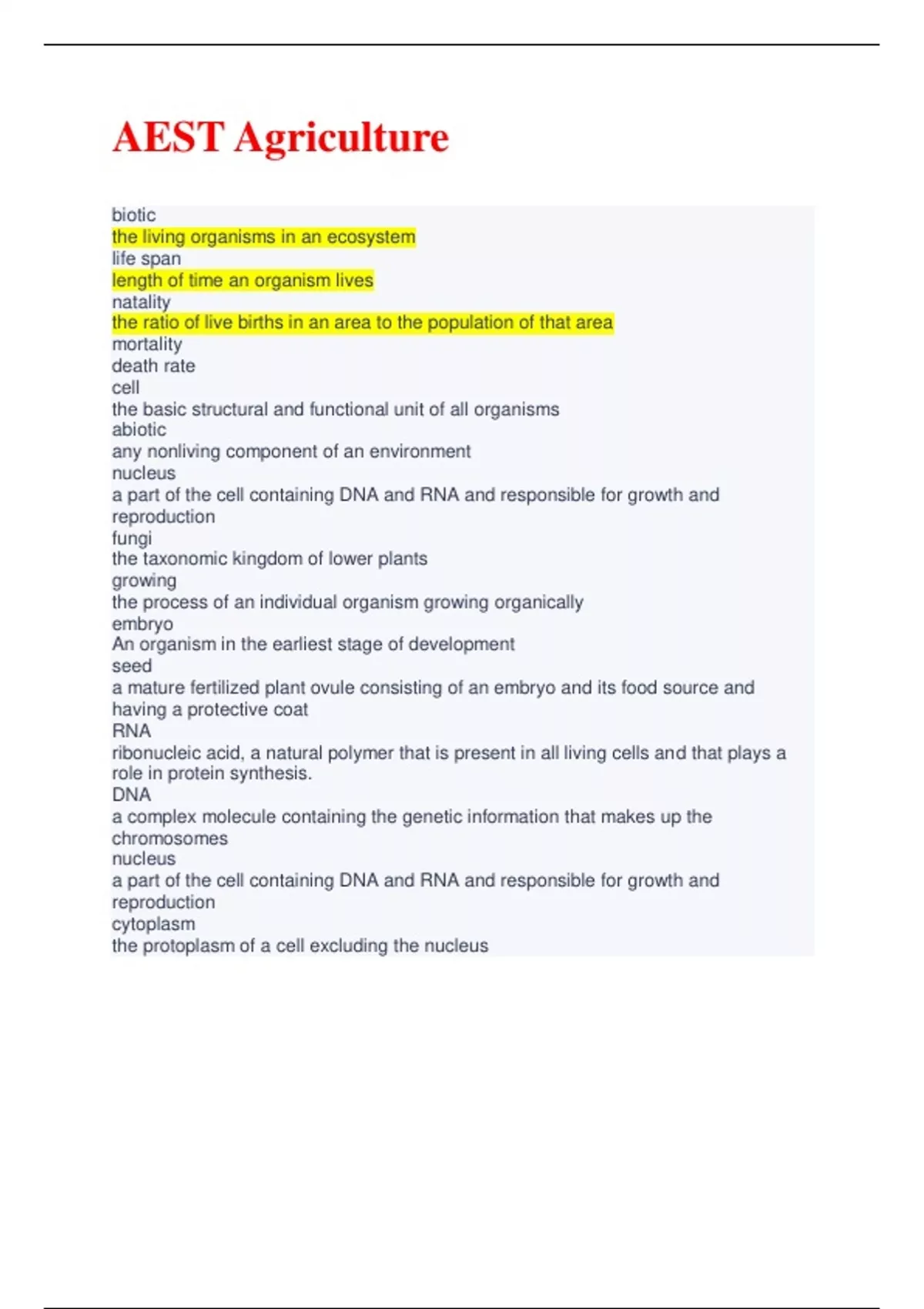 biotic the living organisms in an ecosystem life span length of time an organism lives natality the ratio of live births in an area to the population of that area mortality death rate cell the basic structural and functional unit of all organisms abiotic any nonliving component of an environment nucleus a part of the cell containing DNA and RNA and responsible for growth and reproduction fungi the taxonomic kingdom of lower plants growing the process of an individual organism growing organically embryo An organism in the earliest stage of development seed
