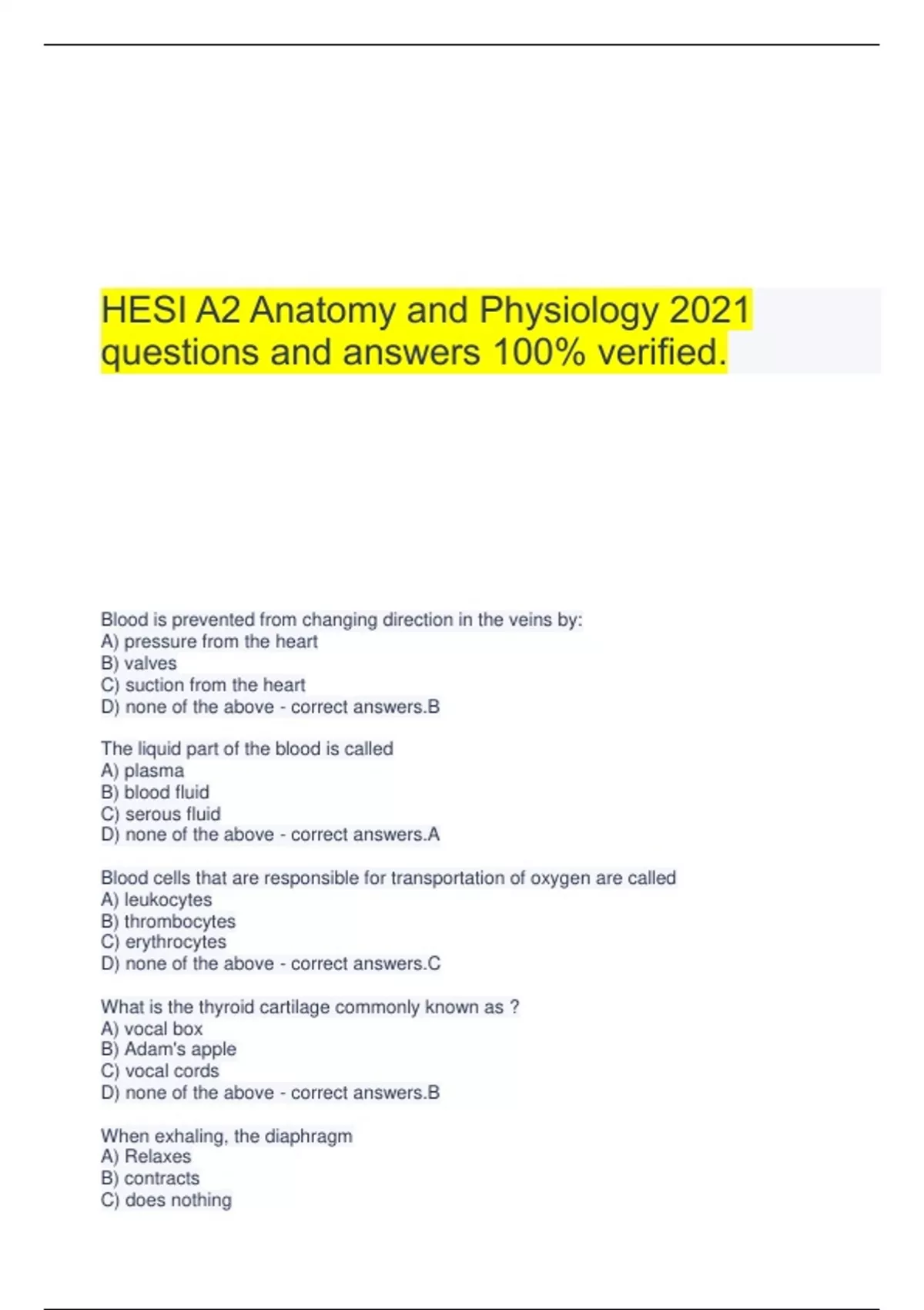HESI A2 Anatomy and Physiology 2021 questions and answers 100% verified. Blood is prevented from changing direction in the veins by: A) pressure from the heart B) valves C) suction from the heart D) none of the above - correct answers.B The liquid part of the blood is called A) plasma B) blood fluid C) serous fluid D) none of the above - correct answers.A Blood cells that are responsible for transportation of oxygen are called A) leukocytes B) thrombocytes C) erythrocytes D) none of the above - correct answers.C What is the thyroid cartilage commonly known as ? A) vocal box B) Adam's apple C) vocal cords D) none of the above - correct answers.B When exhaling, the diaphragm A) Relaxes B) contracts C) does nothing D) none of the above - correct answers.A Which bone forms the rib cage og the thoracic region with the ribs? A) sternum B) fibula C) occipital bone D) none of the above - correct answers.A the humerus and ulna form the A) shoulder joint B) elbow joint C) wrist joint D) none of the above - correct answers.B The patella is also called A) breastbone B) Kneecap C) finger bone D) none of the above - correct answers.B The bone that is stationary during the movement is called the: A) insertion B) agonist C) origin D) none of the above - correct answers.C How many origin does a quadriceps have? A) 4 B) 5 C) 3 D) none of the above - correct answers.A Which part of the brain is responsible for higher brain functions? A) the pons B) the cerebral cortex C) the cerebellar cortex D) none of the above - correct answers.B How many thoracic spinal nerves are in the human body? A) 8 B) 9 C) 12 D) none of the above - correct answers.C In which region of the small intestine are most of the nutrients absorbed? A) the jejunum B) the ileum C) the duodenum D) none of the above - correct answers.A Testes are an organ found in A) females B) plants C) males D) amoebas - correct answers.C What are the two main parts of the human body's central nervous system? A) the heart and the spinal cord B) the brain and the spinal cord C) the peripheral nerves and the brain D) the spinal cord and the peripheral nerves - correct answers.B When measuring blood pressure, the numbers represent: A) the systolic and diastolic pressures, respectively B) the diastolic and systolic pressures, respectively C) the pressure in the arteries and the veins, respectively D) none of the above - correct answers.A The superior vena cava A) ascends from the right atrium B) ascends from the left atrium C) descends from the right atrium D) none of the above - correct answers.A The rectum is a part of : A) the anus B) the large intestine C) the small intestine D) none of the above - correct answers.B Where does digestion start? A) the stomach B) the small intestine C) the mouth D) none of the above - correct answers.C The large intestine mainly: A) absorbs water B) digests food C) moves the food from the esophagus to the small intestine D) none of the above - correct answers.A What is the name of the process that happens in the red bone marrow? A) hematopoiesis B) bone fusing C) calcification D) none of the above - correct answers.A The vertebral column protects the A) brain B) heart C) spinal column D) none of the above - correct answers.C In the digestive system, the majority of nutrients are absorbed in the: A) esophagus B) stomach C) small intestine