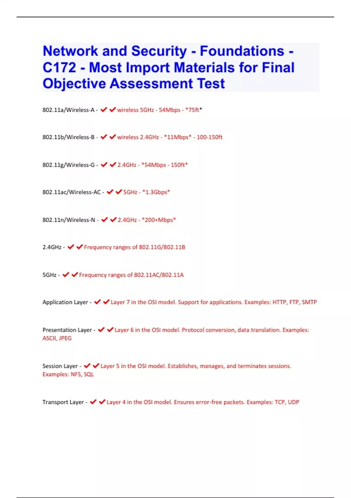 802.11a/Wireless-A - wireless 5GHz - 54Mbps - *75ft* 802.11b/Wireless-B - wireless 2.4GHz - *11Mbps* - 100-150ft 802.11g/Wireless-G - 2.4GHz - *54Mbps - 150ft* 802.11ac/Wireless-AC - 5GHz - *1.3Gbps* 802.11n/Wireless-N - 2.4GHz - *200+Mbps* 2.4GHz - Frequency ranges of 802.11G/802.11B 5GHz - Frequency ranges of 802.11AC/802.11A Application Layer - Layer 7 in the OSI model. Support for applications. Examples: HTTP, FTP, SMTP Presentation Layer - Layer 6 in the OSI model. Protocol conversion, data translation. Examples: ASCII, JPEG